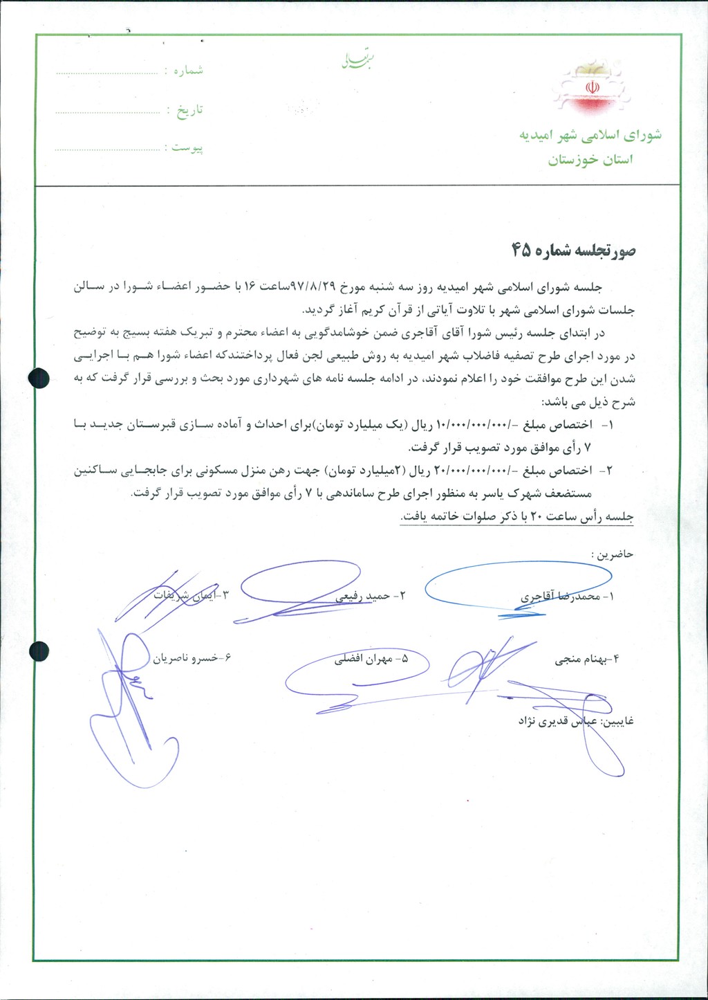 گزارش جلسه شماره ۴۵ شورای اسلامی شهر امیدیه