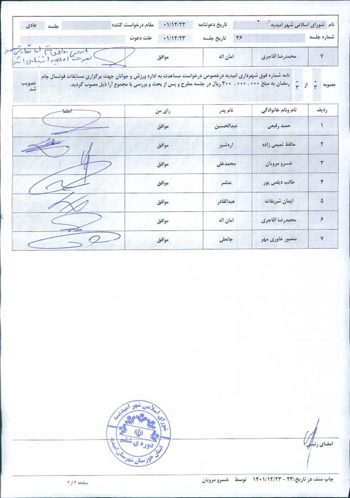 مذاکرات بند ۳: درخواست مساعدت اداره ورزش و جوانان جهت برگزاری مسابقات فوتسال جام رمضان ،پس از طرح و جمع بندی نهایی مورد موافقت اعضاء شورا قرار گرفت و تصویب شد.