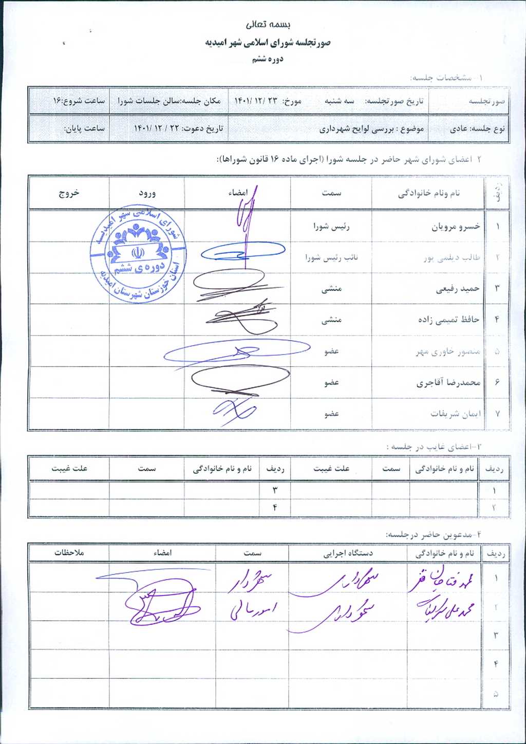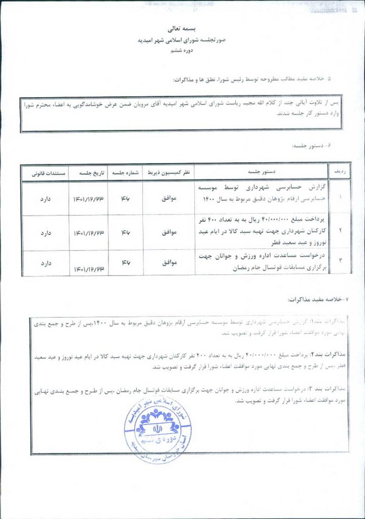 مذاکرات بند۱: گزارش حسابرسی شهرداری توسط موسسه حسابرسی ارقام پژوهان دقیق مربوط به سال ۱۴۰۰،پس از طرح و جمع بندی نهایی مورد موافقت اعضاء شورا قرار گرفت و تصویب شد.