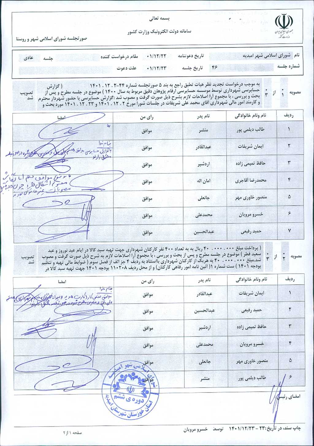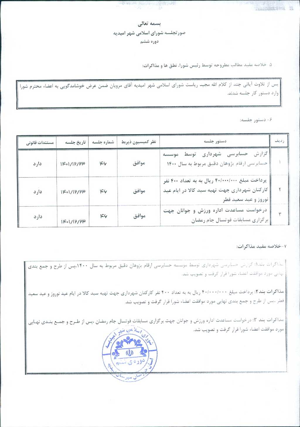 مذاکرات بند۲: پرداخت مبلغ ۰۰۰/۰۰۰/ ۴۰ ریال به به تعداد ۴۰۰ نفر کارکنان شهرداری جهت تهیه سبد کالا در ایام عید نوروز و عید سعید فطر ،پس از طرح و جمع بندی نهایی مورد موافقت اعضاء شورا قرار گرفت و تصویب شد.