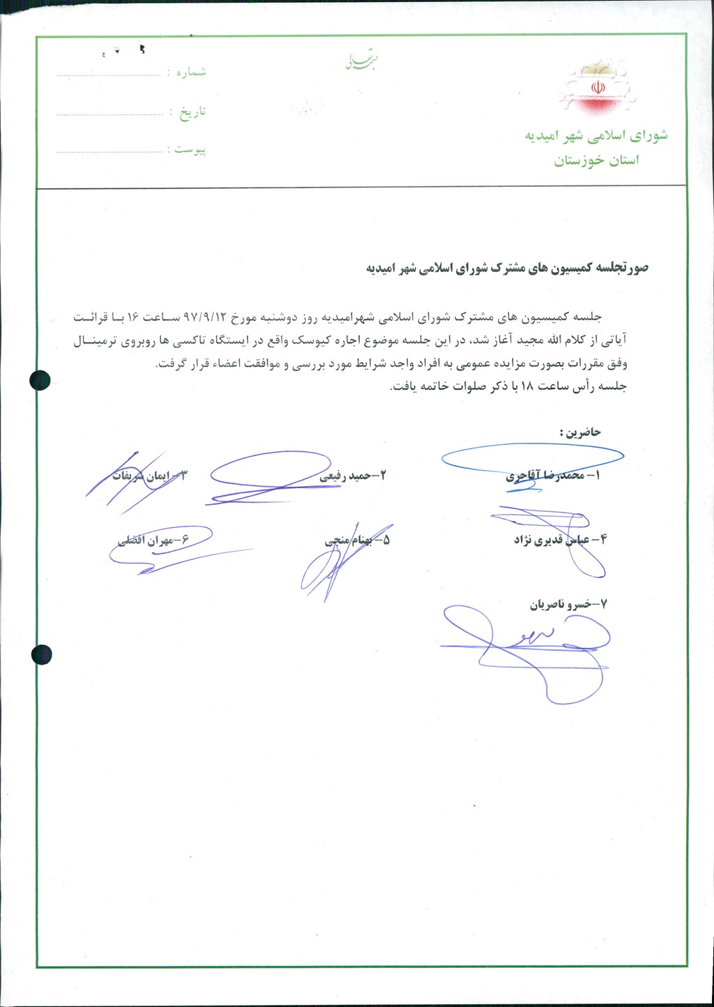 جلسه کمیسیون های مشترک شورای اسلامی شهرامیدیه روز دوشنبه مورخ ۱۲/۹/۹۷ ساعت ۱۶ با قرائت آیاتی از کلام الله مجید آغاز شد، در این جلسه موضوع اجاره کیوسک واقع در ایستگاه تاکسی ها روبروی ترمینال وفق مقررات بصورت مزایده عمومی به افراد واجد شرایط مورد بررسی و موافقت اعضاء قرار گرفت.
