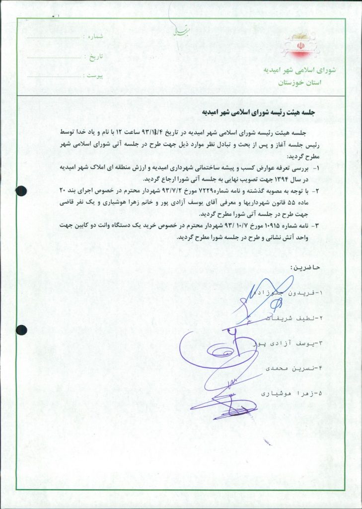 گزارش جلسه شماره ۴۷ مورخ ۹۳/۱۱/۴ هیئت رئیسه شورای اسلامی شهر امیدیه