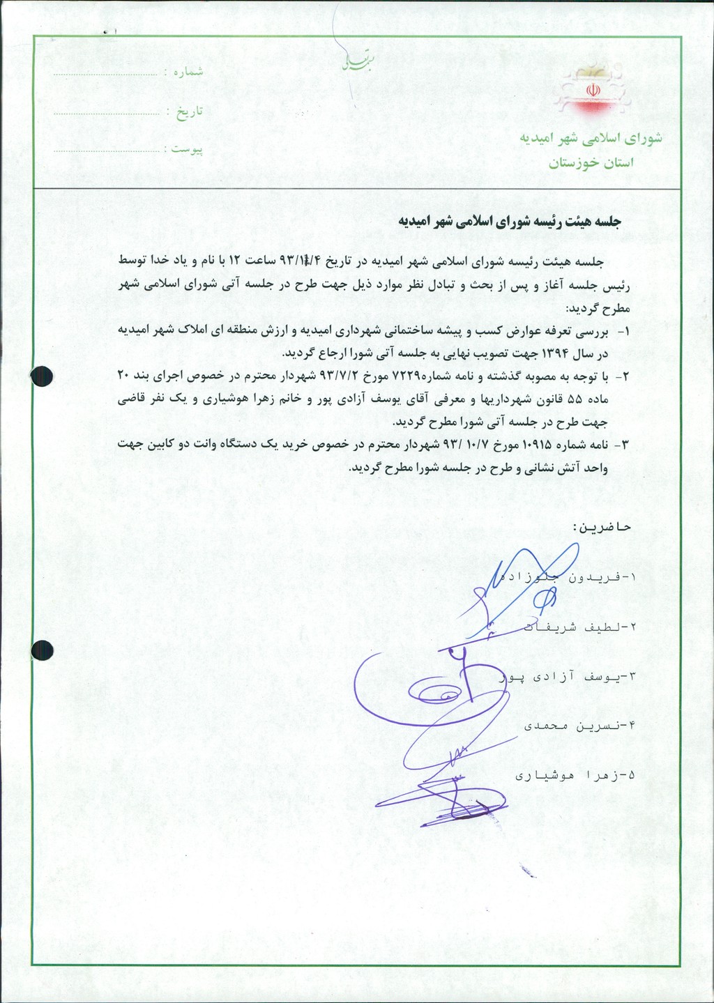 جلسه هیئت رئیسه شورای اسلامی شهر امیدیه در تاریخ ۴/۱۱/۹۳ ساعت ۱۲ با نام و یاد خدا توسط رئیس جلسه آغاز و پس از بحث و تبادل نظر موارد ذیل جهت طرح در جلسه آتی شورای اسلامی شهر مطرح گردید: