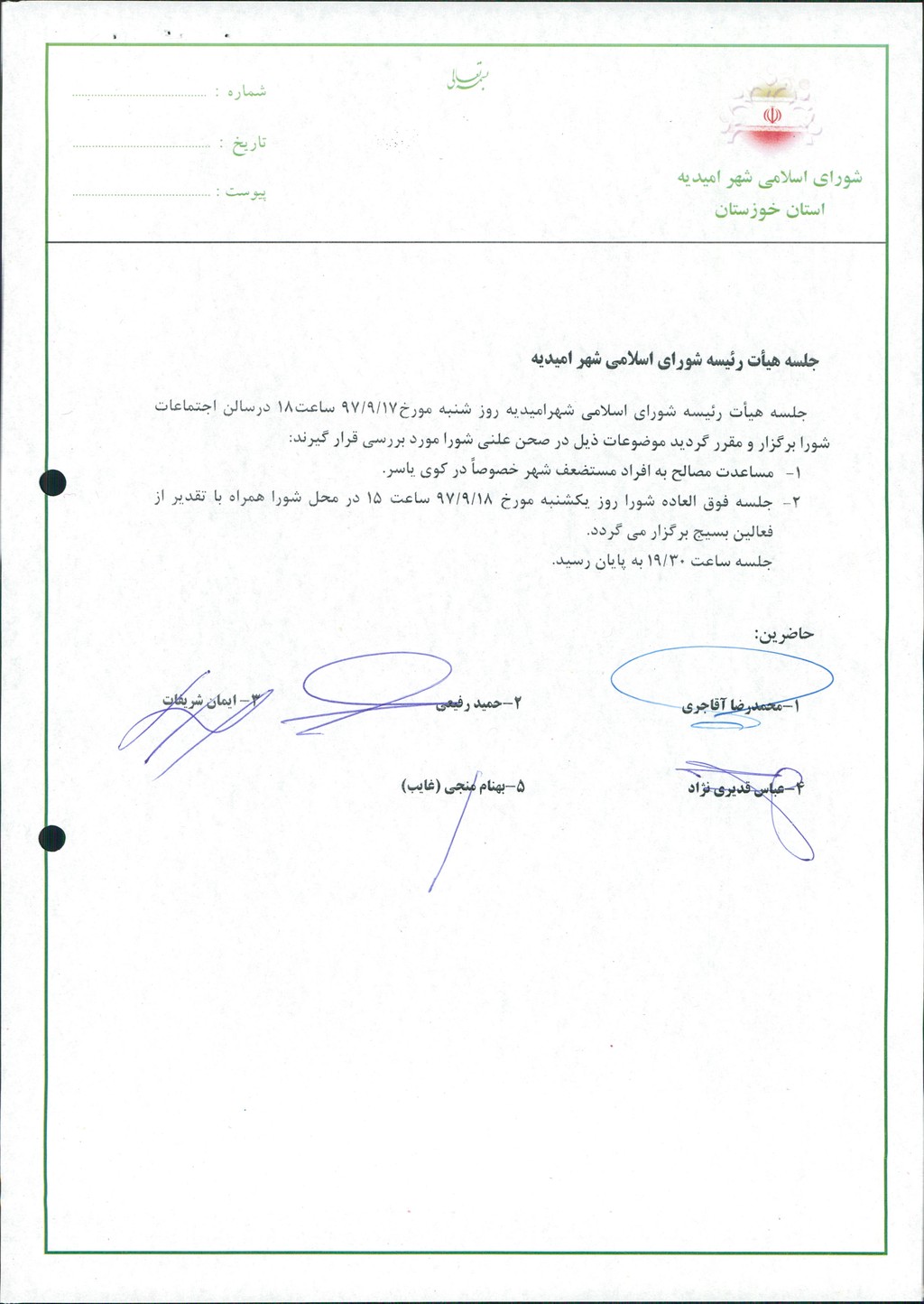 جلسه هیأت رئیسه شورای اسلامی شهرامیدیه روز شنبه مورخ۱۷/۹/۹۷ ساعت۱۸ درسالن اجتماعات شورا برگزار و مقرر گردید موضوعات ذیل در صحن علنی شورا مورد بررسی قرار گیرند:
