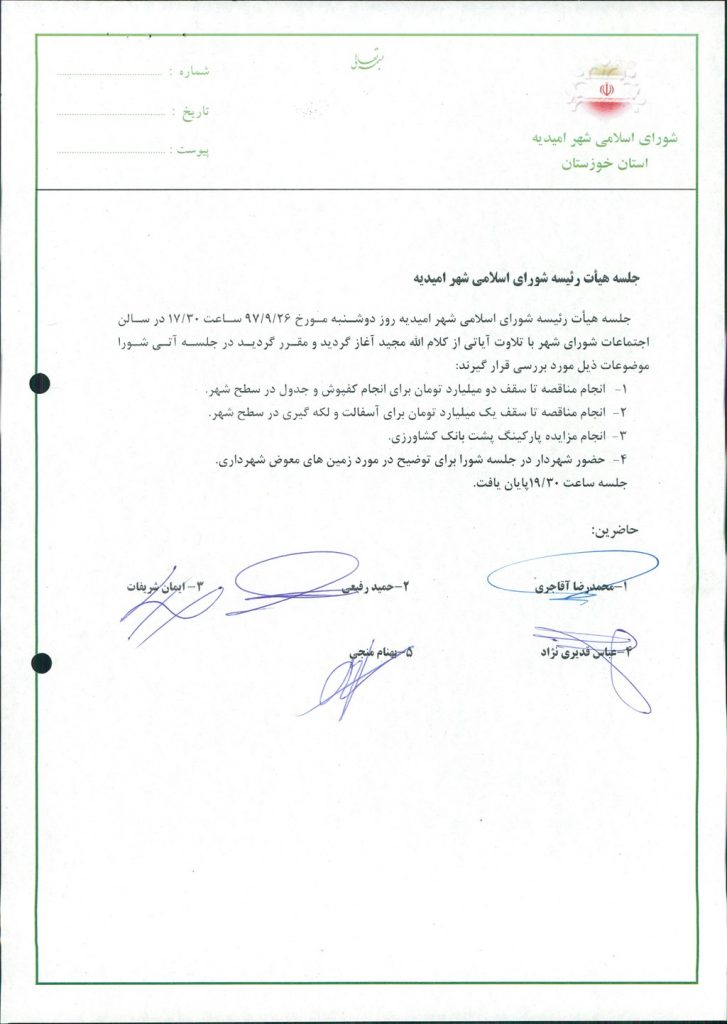جلسه هیأت رئیسه شورای اسلامی شهر امیدیه روز دوشنبه مورخ ۲۶/۹/۹۷ ساعت ۳۰/۱۷ در سالن اجتماعات شورای شهر با تلاوت آیاتی از کلام الله مجید آغاز گردید و مقرر گردید در جلسه آتی شورا موضوعات ذیل مورد بررسی قرار گیرند: