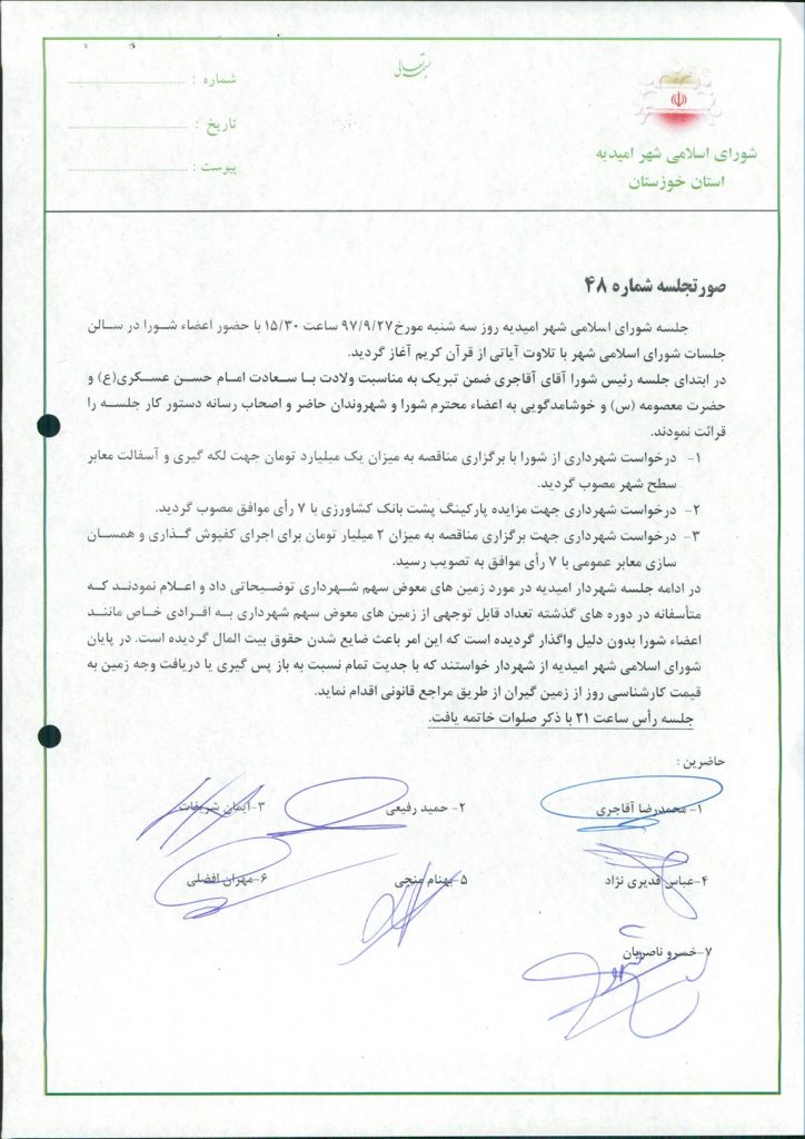 گزارش جلسه شماره ۴۸ مورخ ۹۷/۹/۲۷ شورای اسلامی شهر امیدیه