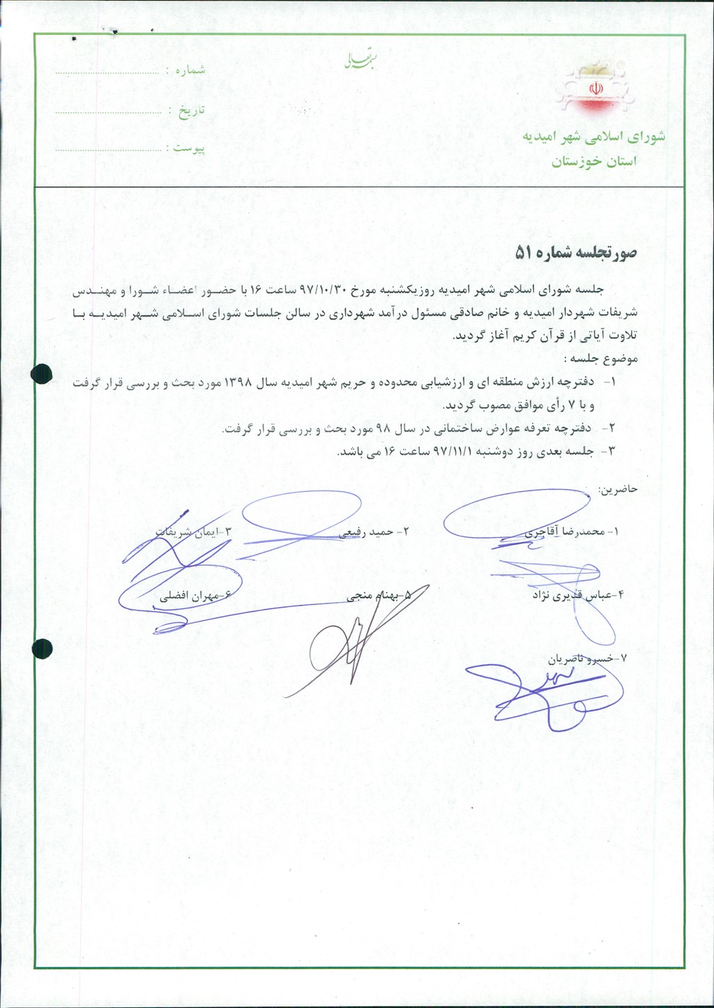جلسه شورای اسلامی شهر امیدیه روزیکشنبه مورخ ۳۰/۱۰/۹۷ ساعت ۱۶ با حضور اعضاء شورا و مهندس شریفات شهردار امیدیه و خانم صادقی مسئول درآمد شهرداری در سالن جلسات شورای اسلامی شهر امیدیه با تلاوت آیاتی از قرآن کریم آغاز گردید.