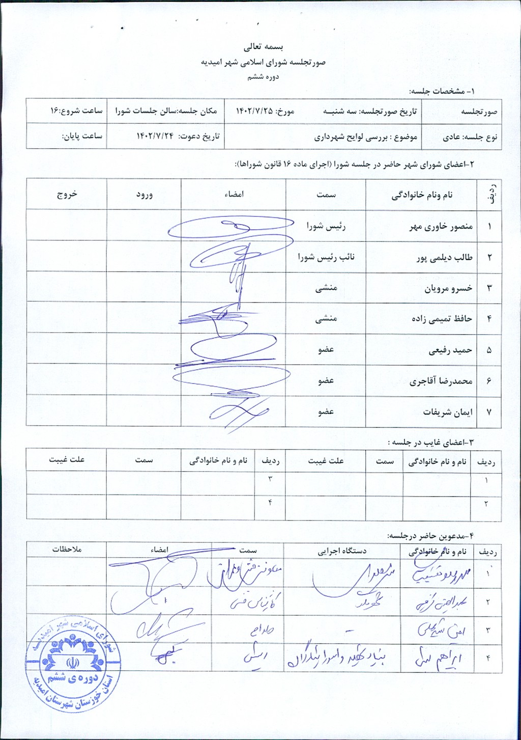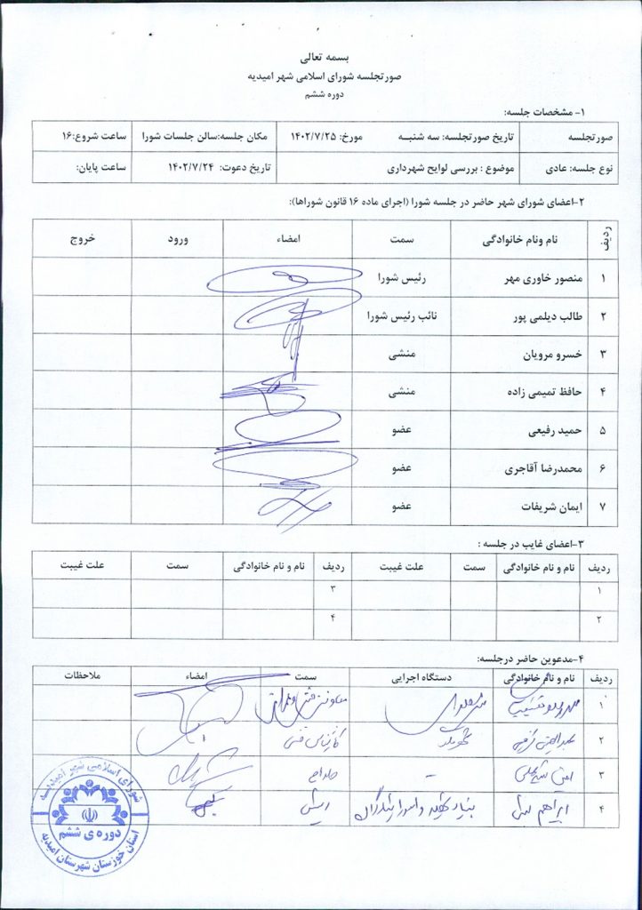 پس از تلاوت آیاتی چند از کلام الله مجید آقای خاوری مهر رییس شورای اسلامی شهر امیدیه ضمن عرض خوشامدگویی به اعضاء محترم شورا و مدعوین جلسه وارد دستور کار جلسه شدند و لوایح شهرداری را به شرح ذیل مطرح نمودند