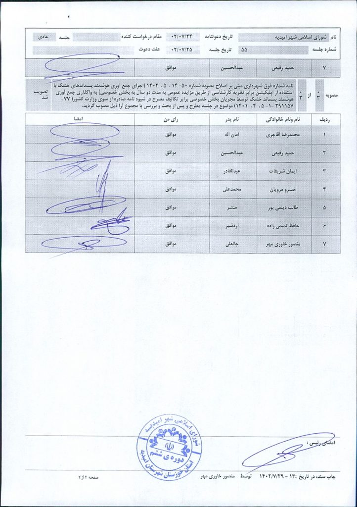 اصلاح مصوبه شماره ۵۰- ۱۴/ ۵/ ۱۴۰۲ (اجرای جمع آوری هوشمند پسماندهای خشک با استفاده از اپلیکیشن برابر نظریه کارشناسی از طریق مزایده عمومی به مدت دو سال به بخش خصوصی) به واگذاری جمع آوری هوشمند پسماند خشک توسط مجریان بخش خصوصی برابر تکالیف مصرح در شیوه نامه صادره از سوی وزارت کشور(۷۷ / ۱- ۲۹۱۱۵۷- ۵/ ۴/ ۱۴۰۱)