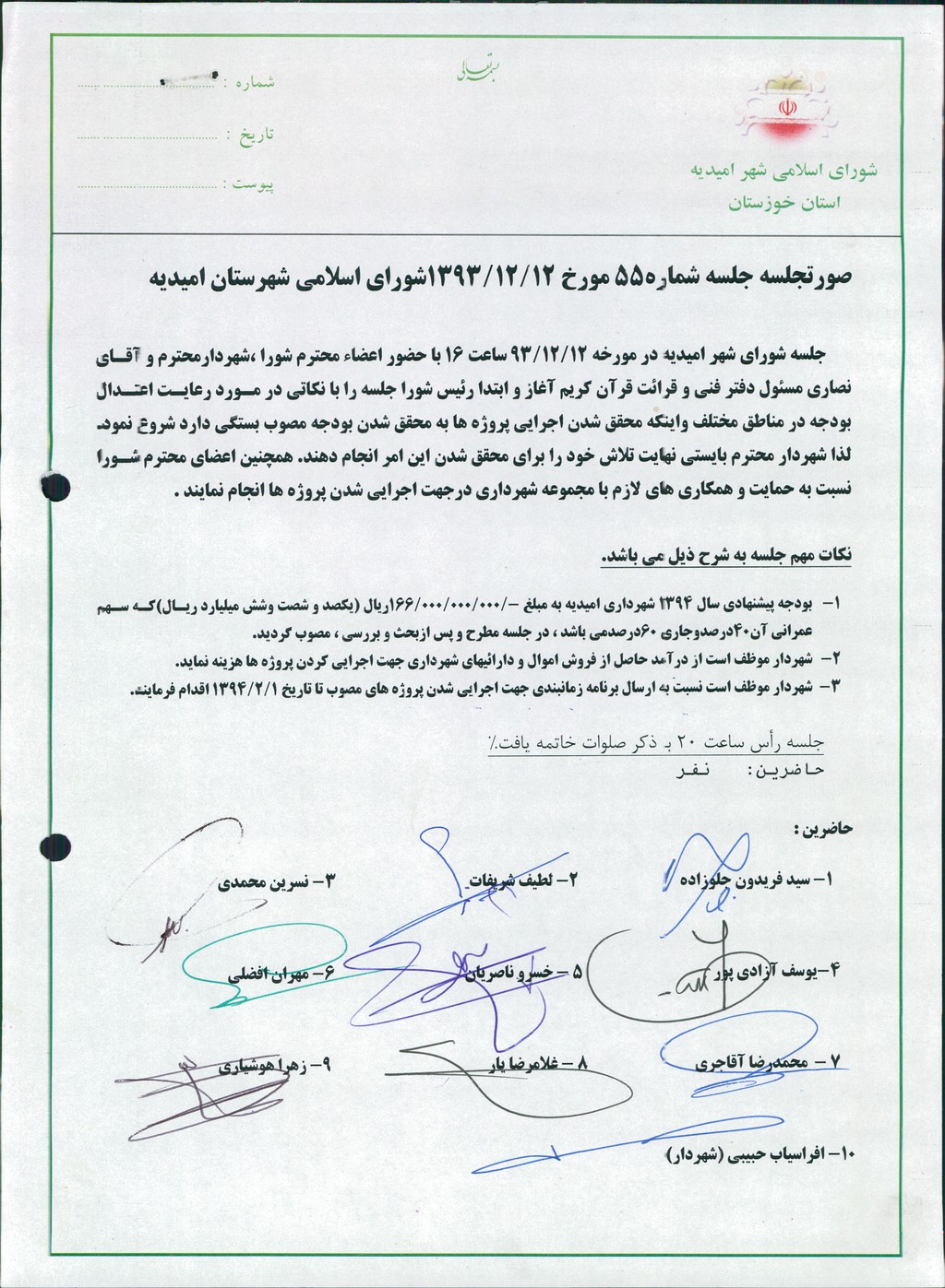 گزارش جلسه شماره ۵۵ مورخ ۹۳/۱۲/۱۲ شورای اسلامی شهر امیدیه