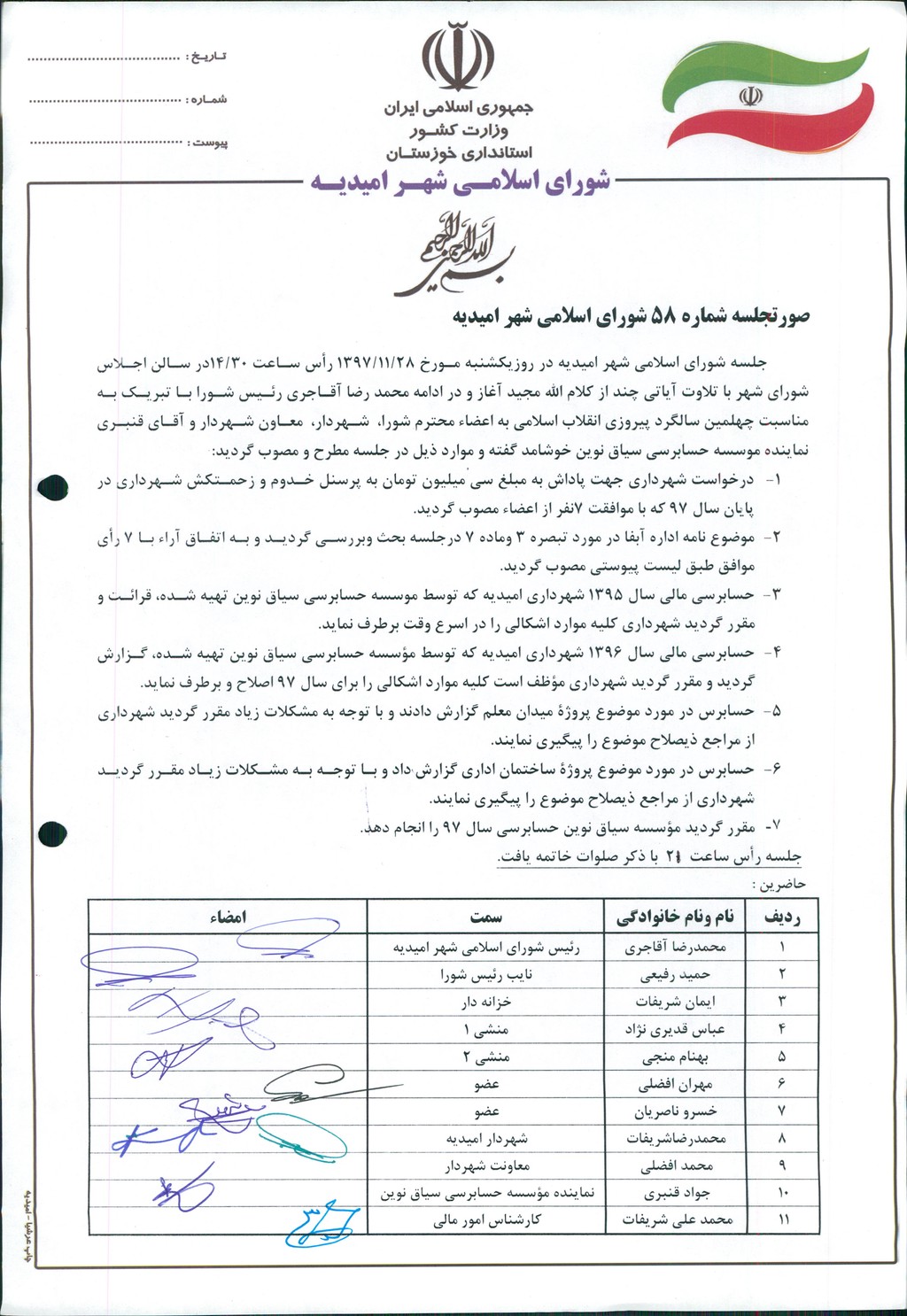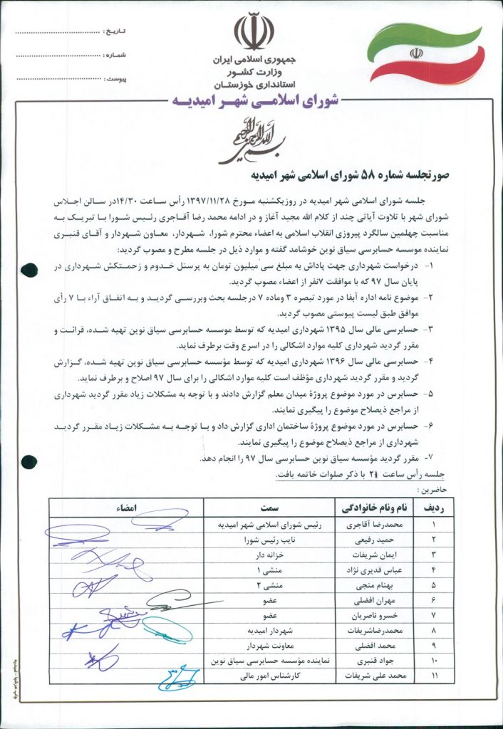 گزارش جلسه شماره ۵۸ مورخ۹۷/۱۱/۲۸ شورای اسلامی شهر امیدیه