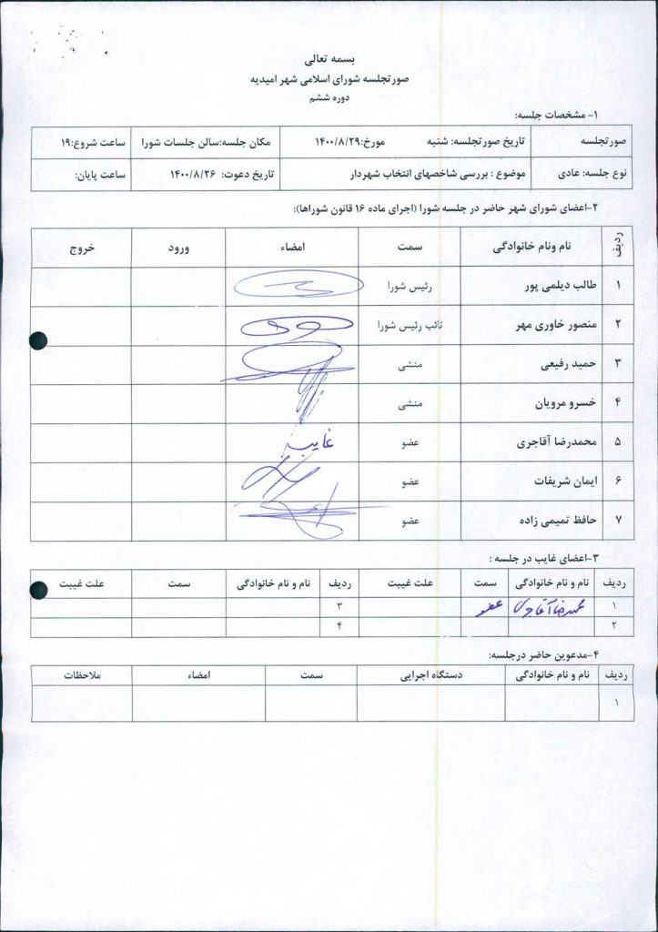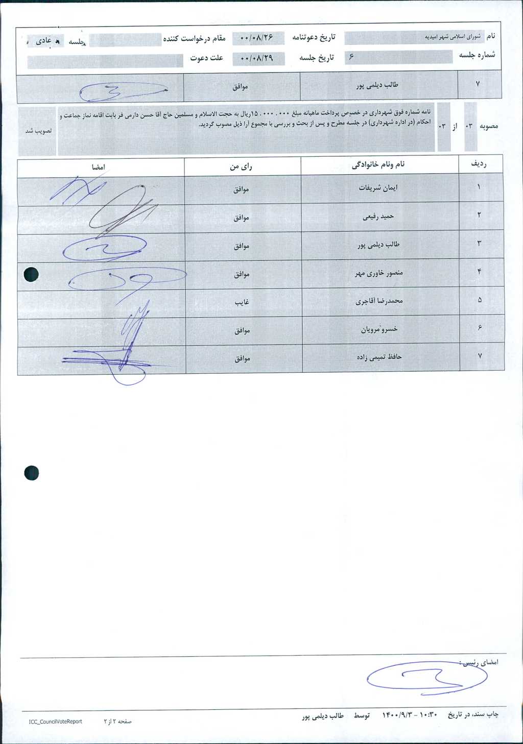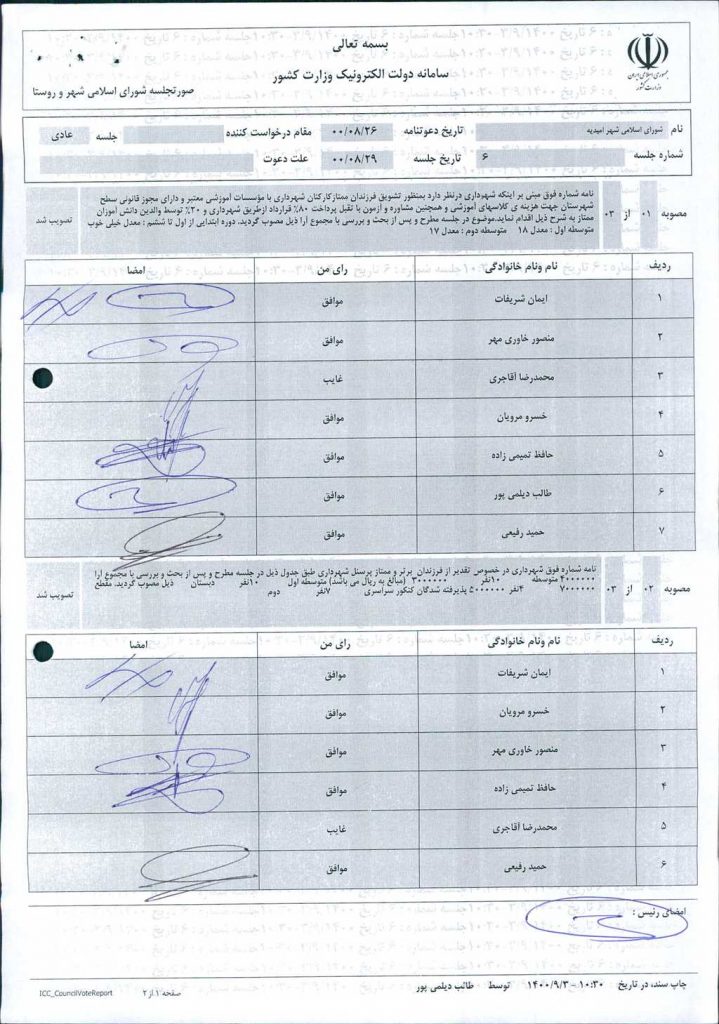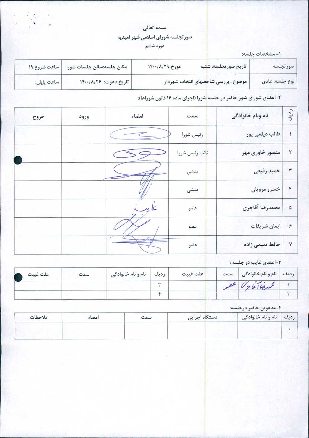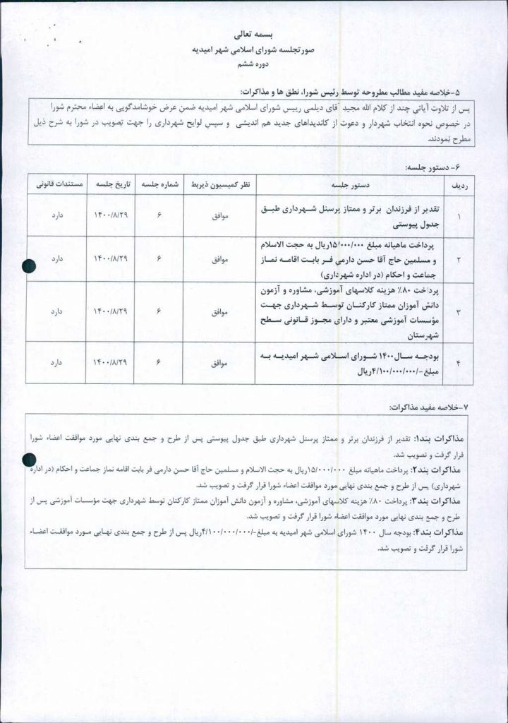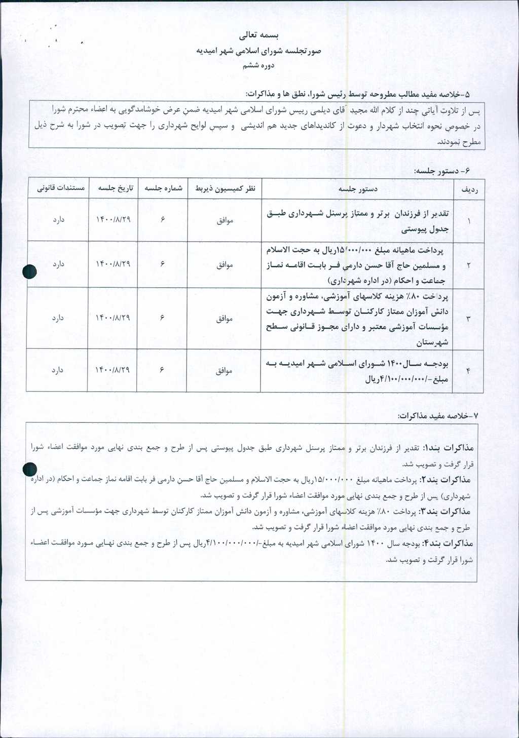 گزارش جلسه شماره ۶ مورخ ۱۴۰۰/۸/۲۹ شورای اسلامی شهر امیدیه