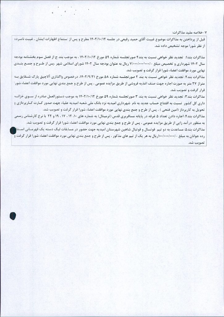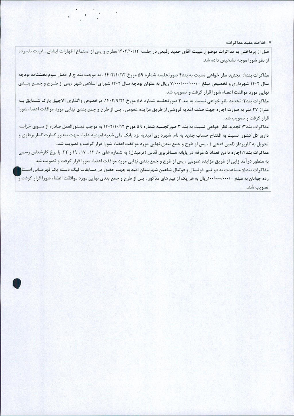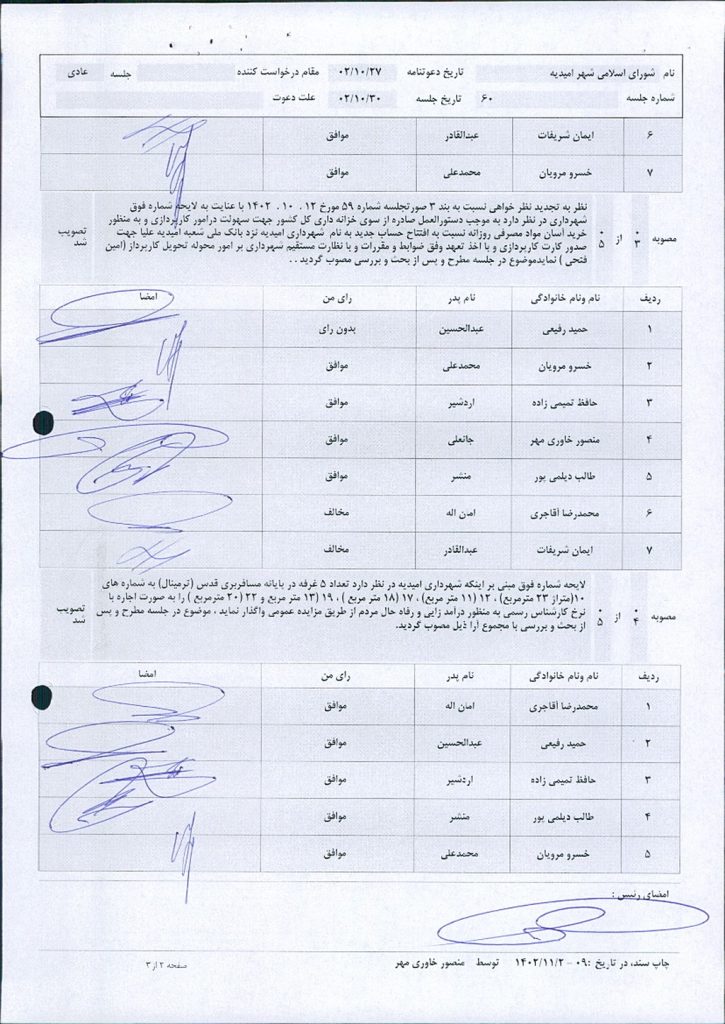 تجدید نظر خواهی نسبت به بند ۳ صورتجلسه شماره ۵۹ مورخ ۱۲/ ۱۰/ ۱۴۰۲ به موجب دستورالعمل صادره از سوی خزانه داری کل کشور نسبت به افتتاح حساب جدید به نام شهرداری امیدیه نزد بانک ملی شعبه امیدیه علیاء جهت صدور کارت کارپردازی و تحویل به کارپرداز (امین فتحی )