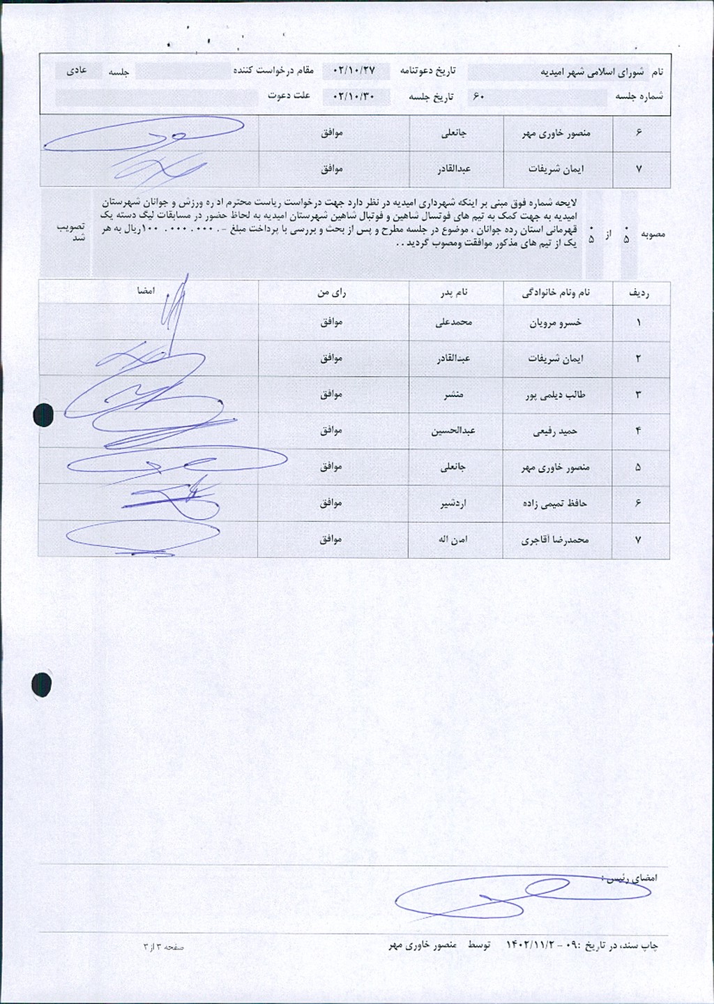 مساعدت به دو تیم فوتسال و فوتبال شاهین شهرستان امیدیه جهت حضور در مسابقات لیگ دسته یک قهرمانی استان رده جوانان به مبلغ -/۰۰۰/۰۰۰/ ۱۰۰ريال به هر یک از تیم های مذکور