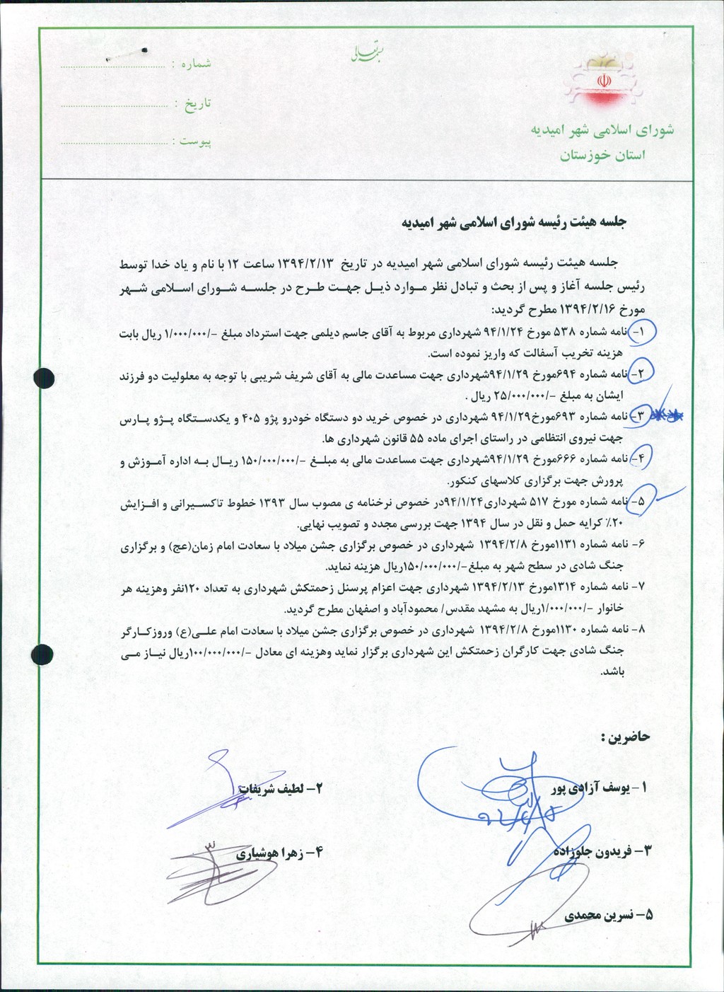 جلسه هیئت رئیسه شورای اسلامی شهر امیدیه در تاریخ ۱۳/۲/۱۳۹۴ ساعت ۱۲ با نام و یاد خدا توسط رئیس جلسه آغاز و پس از بحث و تبادل نظر موارد ذیل جهت طرح در جلسه شورای اسلامی شهر مورخ ۱۶/۲/۱۳۹۴ مطرح گردید: