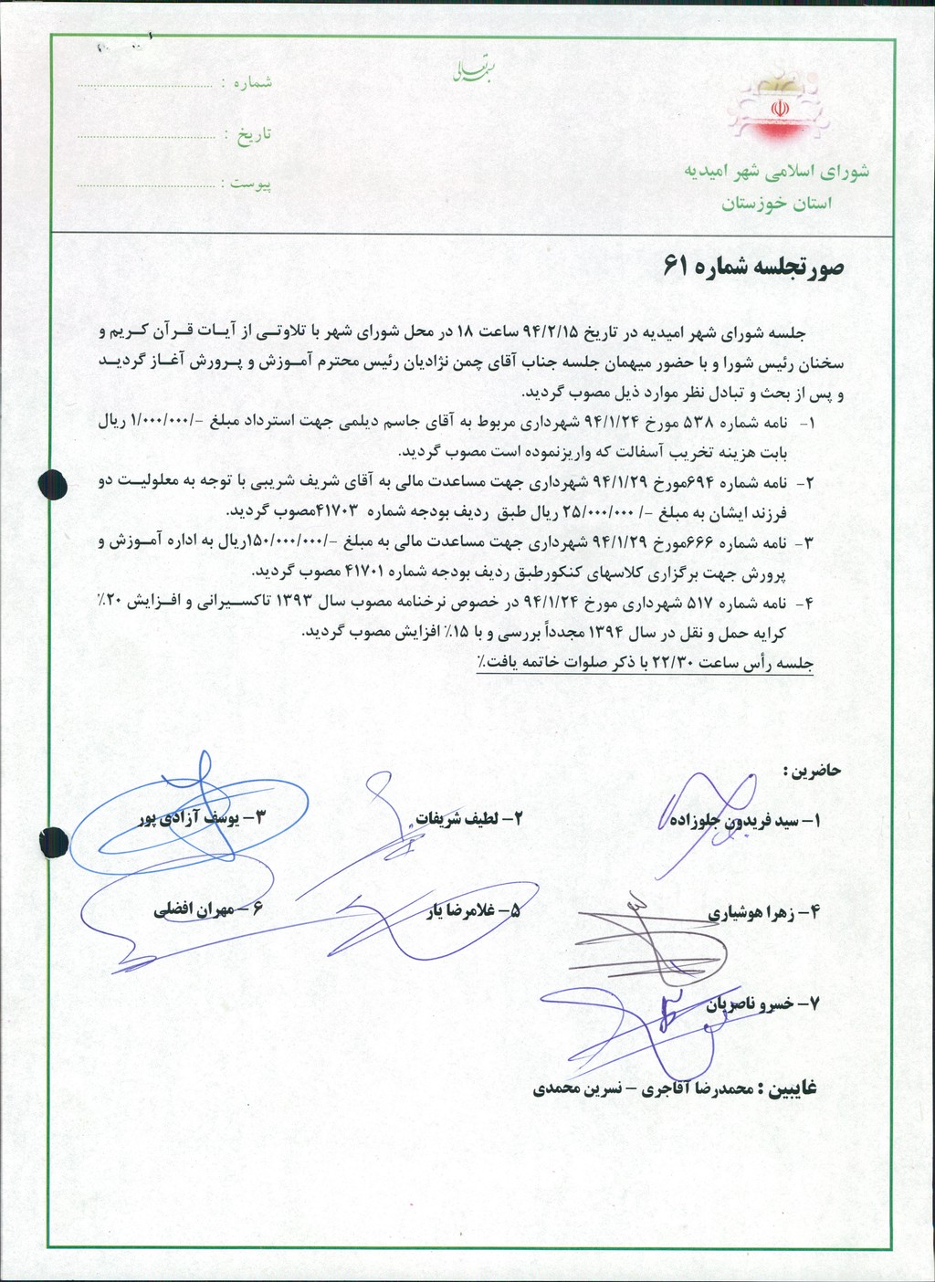 گزارش جلسه شماره ۶۱ شورای اسلامی شهر امیدیه