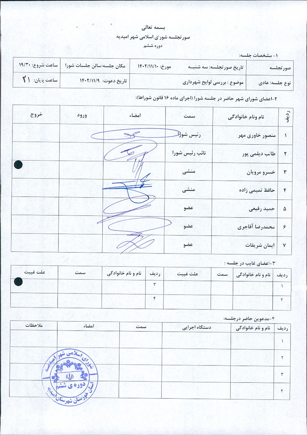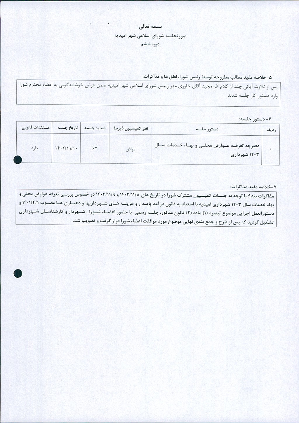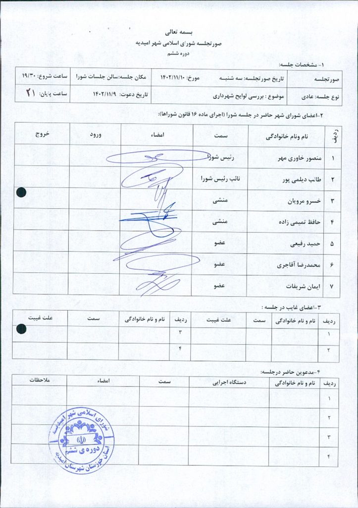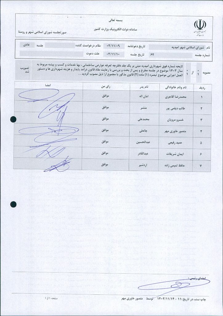 گزارش جلسه شماره ۶۲ مورخ ۱۴۰۲/۱۱/۱۰ شورای اسلامی شهر امیدیه