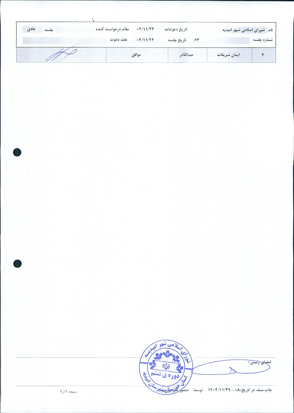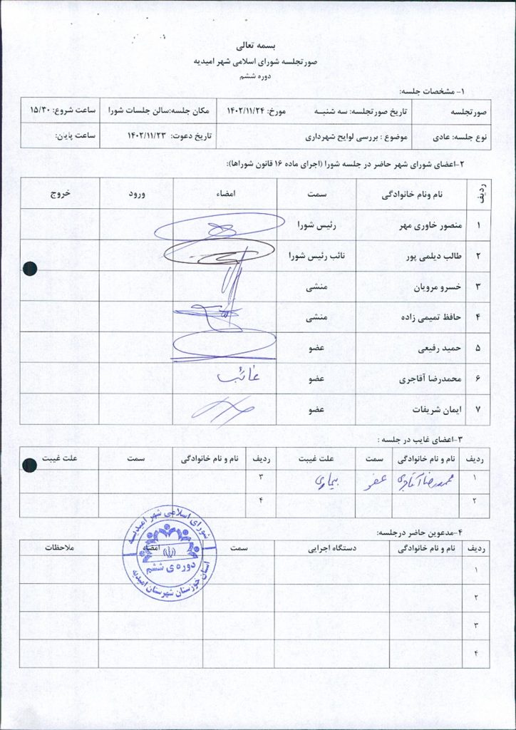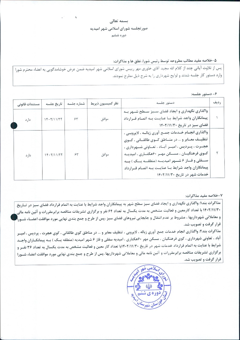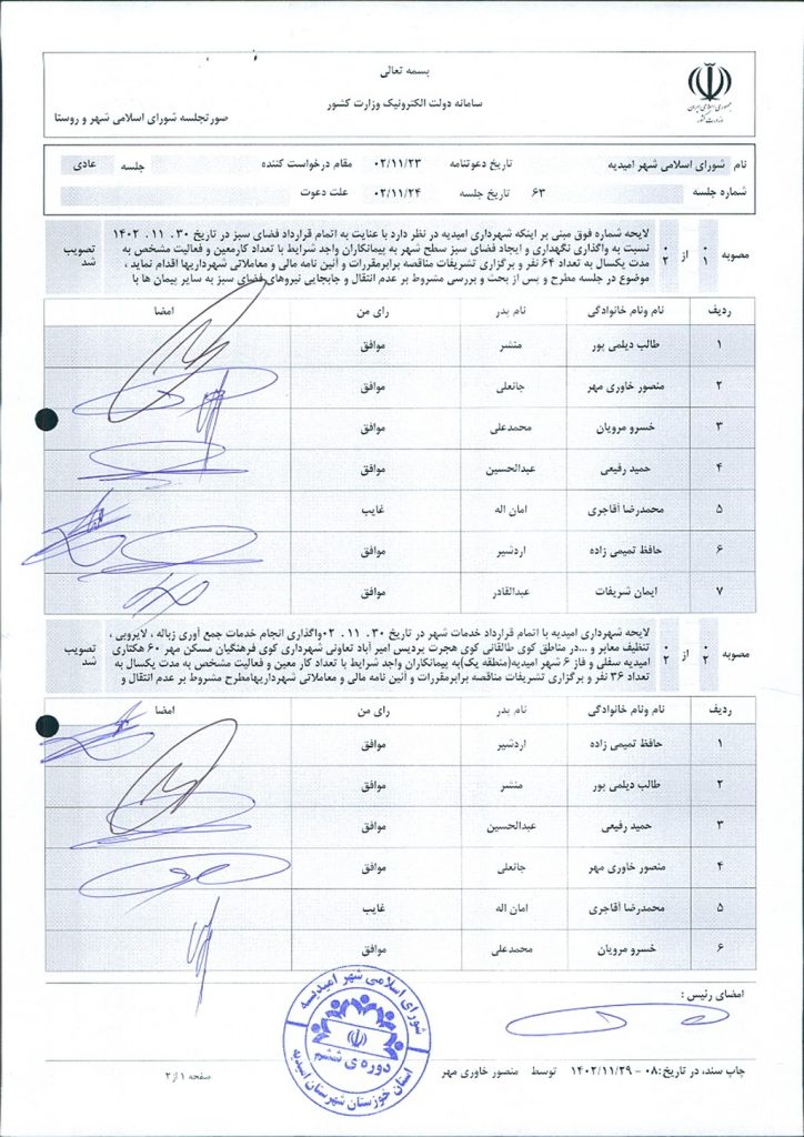 گزارش جلسه شماره ۶۳ شورای اسلامی شهر امیدیه
