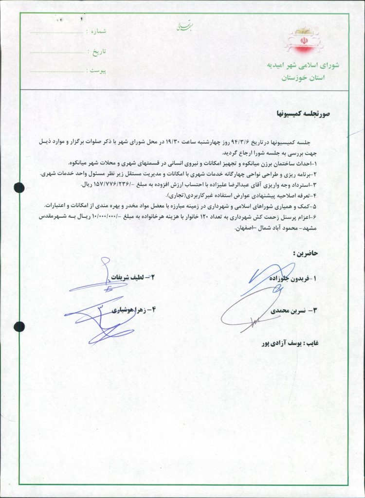 گزارش جلسه شماره ۶۳ مورخ ۹۴/۳/۶ کمیسیون های مشترک شورای اسلامی شهر امیدیه