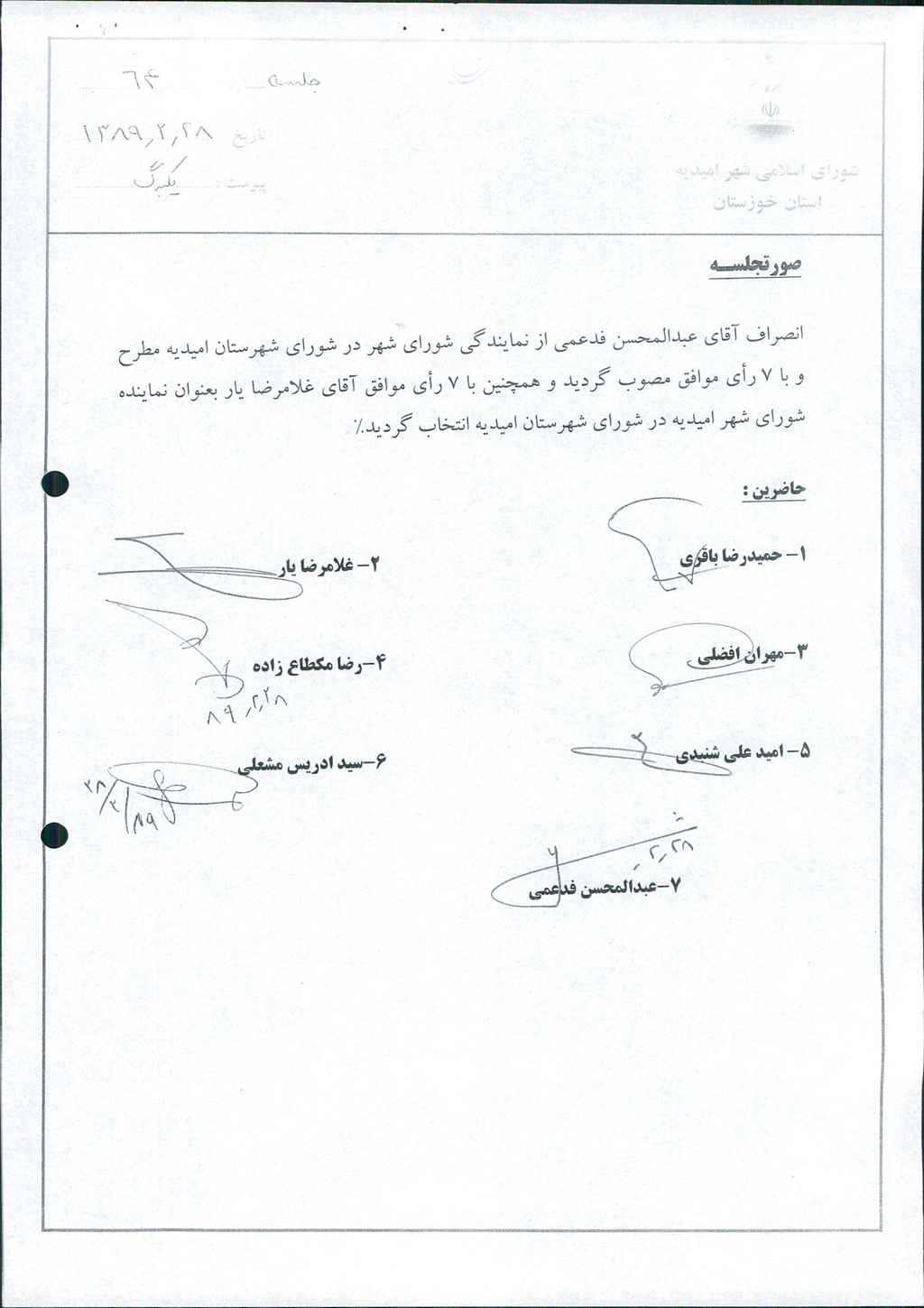 بدینوسیله باستحضار میرساند انصراف آقای عبدالمحسن فدعمی از نمایندگی شورای شهرستان امیدیه مطرح و با ۷ رأی موافق مصوب گردید و همچنین با ۷ رأی موافق آقای غلامرضا یار بعنوان نماینده شورای شهر امیدیه در شورای شهرستان امیدیه انتخاب گردید%