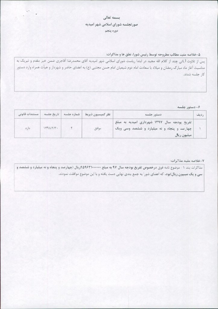 | ۱ | تفریغ بودجه سال ۱۳۹۷ شهرداری امیدیه به مبلغ چهارصد و پنجاه و نه میلیارد و ششصد وسی ویک میلیون ریال | موافق | ۴ | ۳۰/۲/۱۳۹۸ | دارد | |
