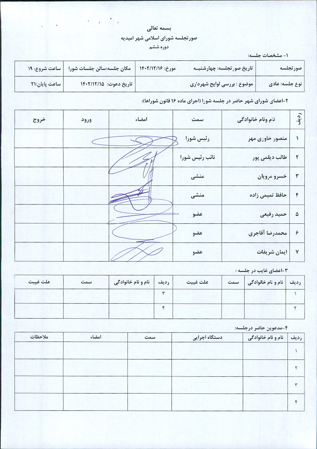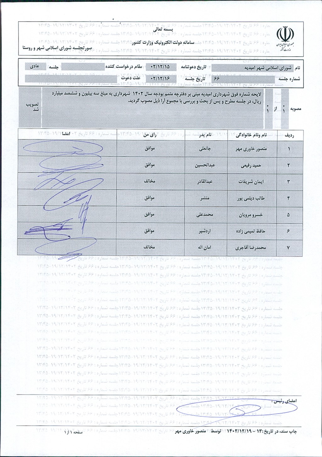 گزارش جلسه شماره ۶۶ مورخ ۱۴۰۲/۱۲/۱۶ شورای اسلامی شهر امیدیه