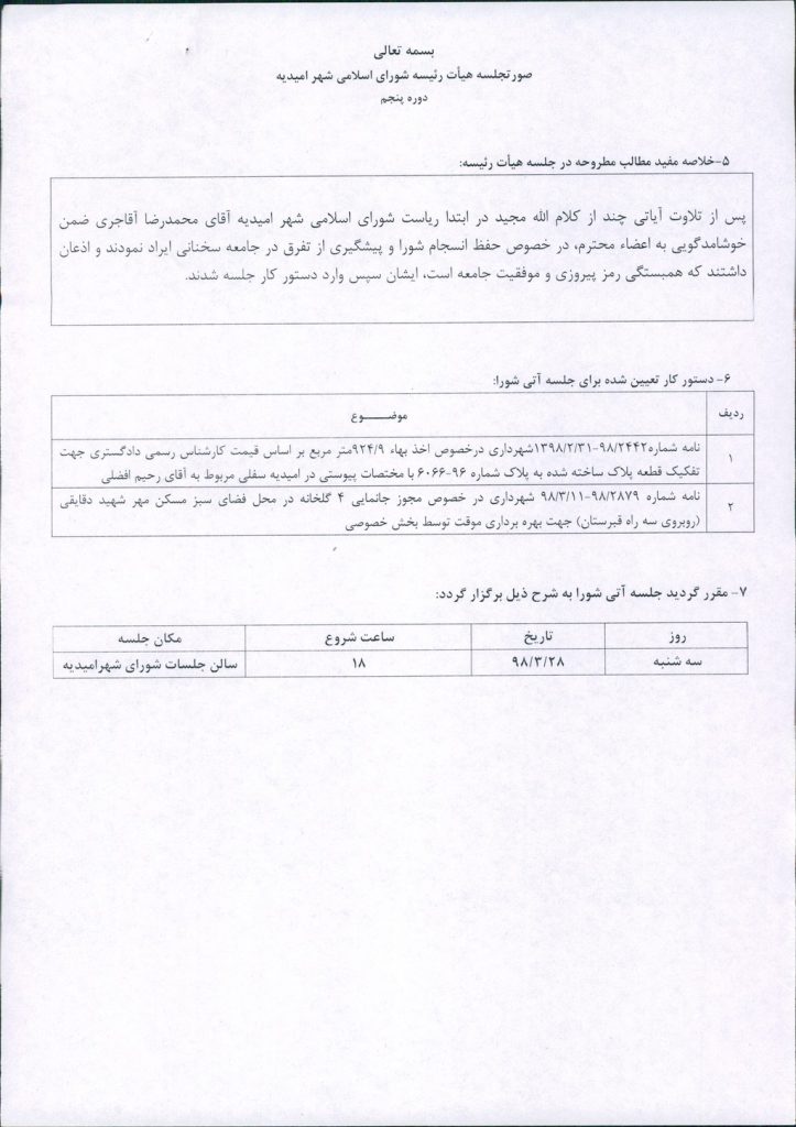 صورتجلسه هیأت رئیسه شورای اسلامی شهر امیدیه