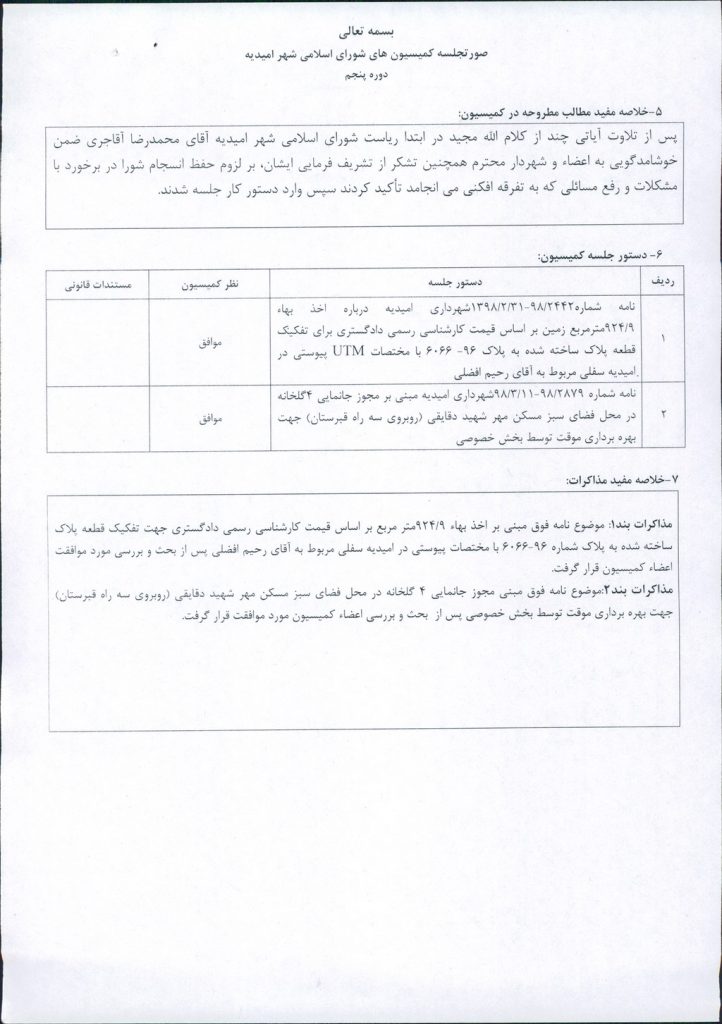 | ۱ | نامه شماره۲۴۴۲/۹۸-۳۱/۲/۱۳۹۸شهرداری امیدیه درباره اخذ بهاء ۹/۹۲۴مترمربع زمین بر اساس قیمت کارشناسی رسمی دادگستری برای تفکیک قطعه پلاک ساخته شده به پلاک ۹۶- ۶۰۶۶ با مختصاتUTM پیوستی در امیدیه سفلی مربوط به آقای رحیم افضلی | موافق | دارد | |