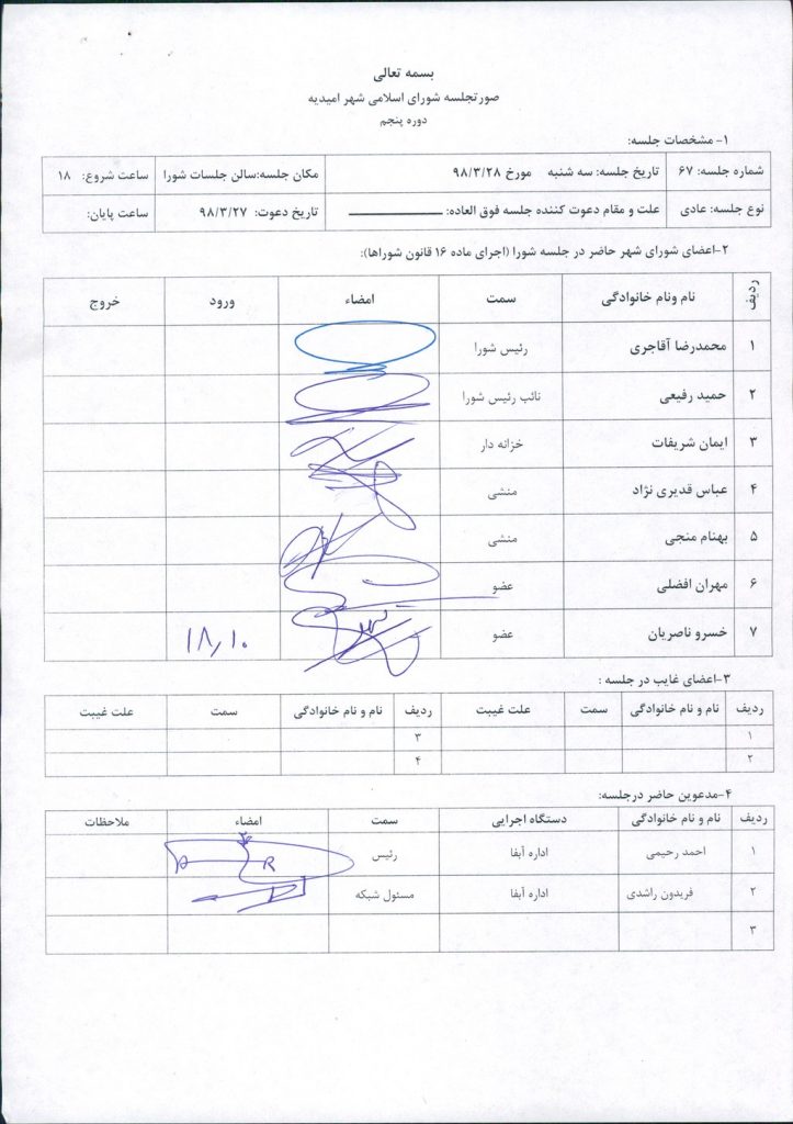 شماره جلسه: ۶۷ تاریخ جلسه: سه شنبه     مورخ ۲۸/۳/۹۸ مکان جلسه:سالن جلسات شورا ساعت شروع:   ۱۸