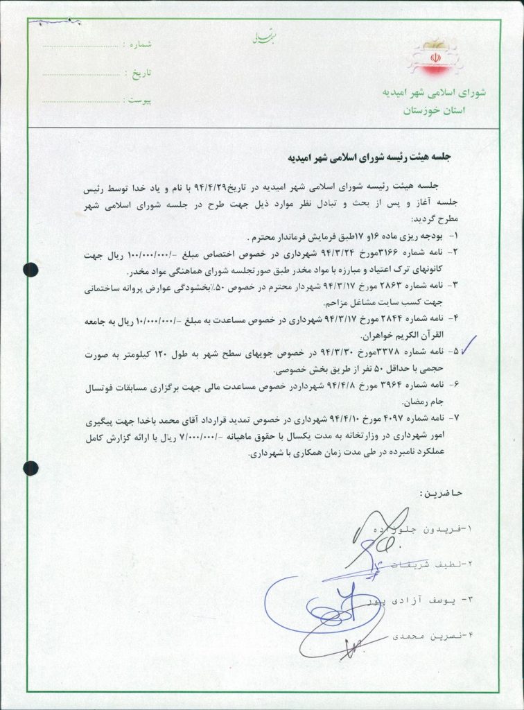 • نامه شماره ۴۰۹۷ مورخ ۱۰/۴/۹۴ شهرداری در خصوص تمدید قرارداد آقای محمد باخدا جهت پیگیری امور شهرداری در وزارتخانه به مدت یکسال با حقوق ماهیانه ۷۰۰۰۰۰۰ریال با ارائه گزارش کامل عملکرد نامبرده در طی مدت زمان همکاری با شهرداری.