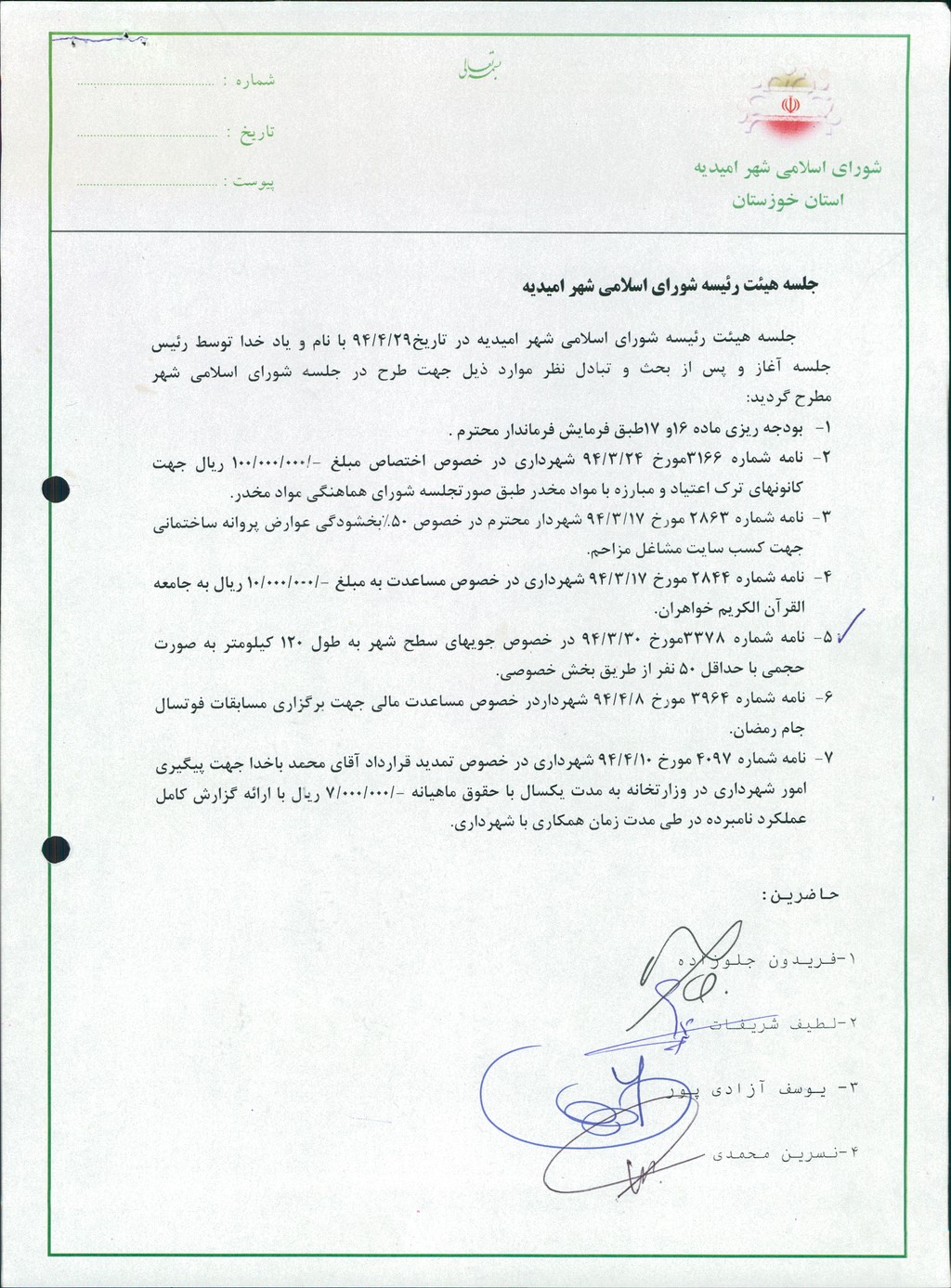 • نامه شماره ۳۱۶۶مورخ ۲۴/۳/۹۴ شهرداری در خصوص اختصاص مبلغ ۱۰۰۰۰۰۰۰۰ ریال جهت کانونهای ترک اعتیاد و مبارزه با مواد مخدر طبق صورتجلسه شورای هماهنگی مواد مخدر.