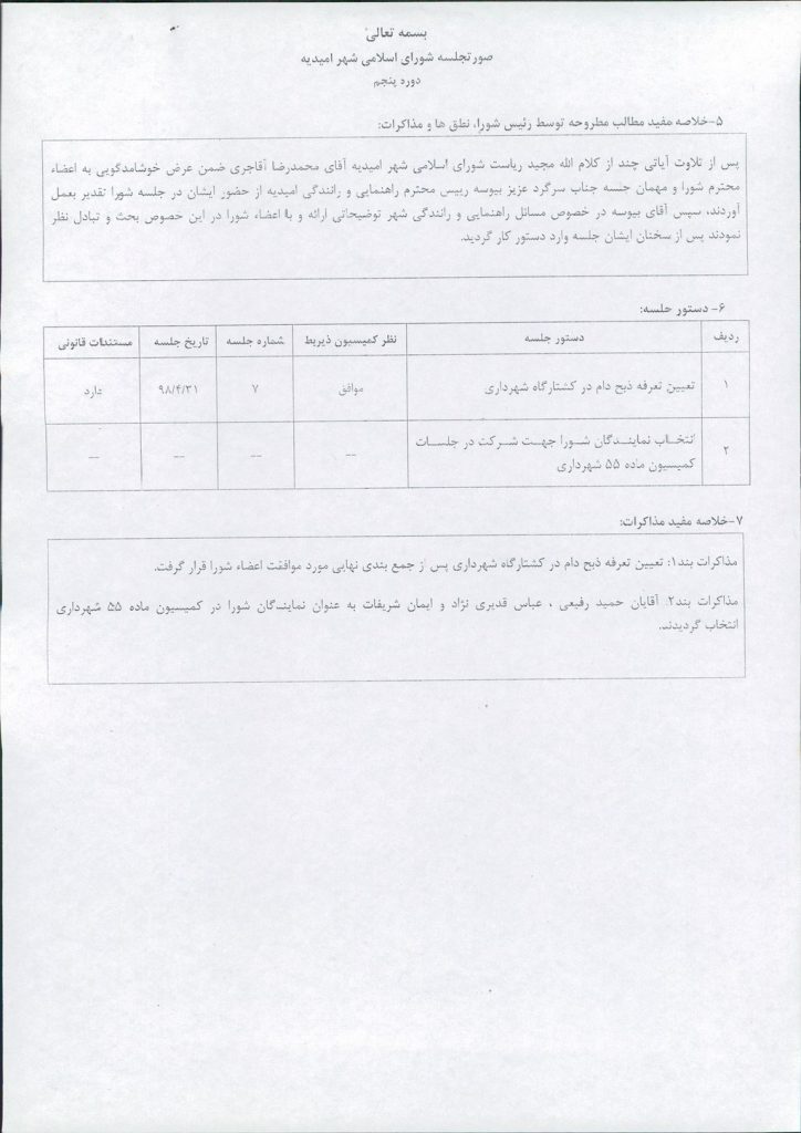 | ۱ | تعیین تعرفه ذبح دام در کشتارگاه شهرداری | موافق | ۷ | ۳۱/۴/۹۸ | دارد | |