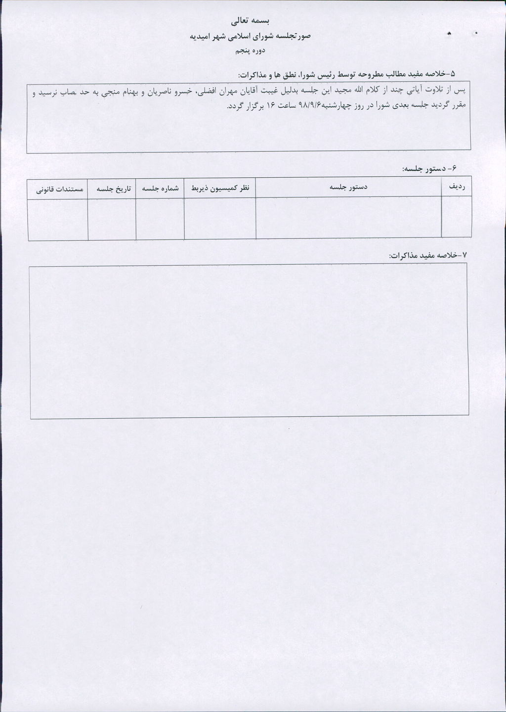 پس از تلاوت آیاتی چند از کلام الله مجید این جلسه بدلیل غیبت آقایان مهران افضلی، خسرو ناصریان و بهنام منجی به حد نصاب نرسید و مقرر گردید جلسه بعدی شورا در روز چهارشنبه۶/۹/۹۸ ساعت ۱۶ برگزار گردد.