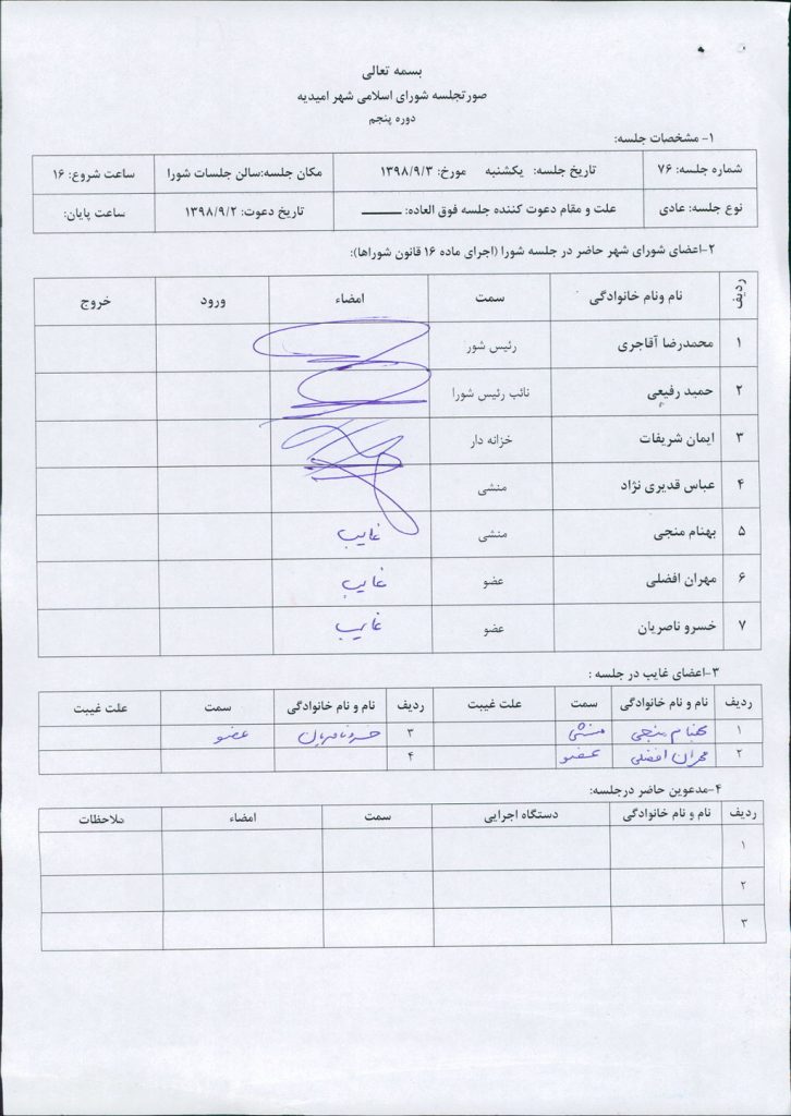 گزارش جلسه شماره ۷۶ مورخ ۹۸/۹/۳ شورای اسلامی شهر امیدیه