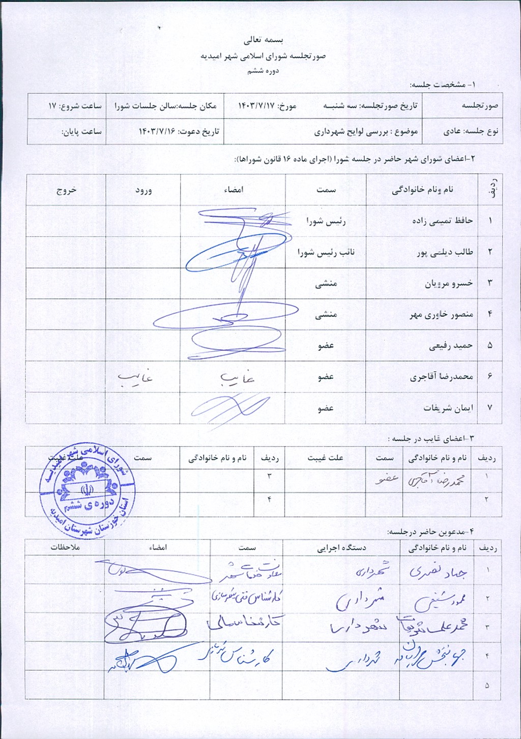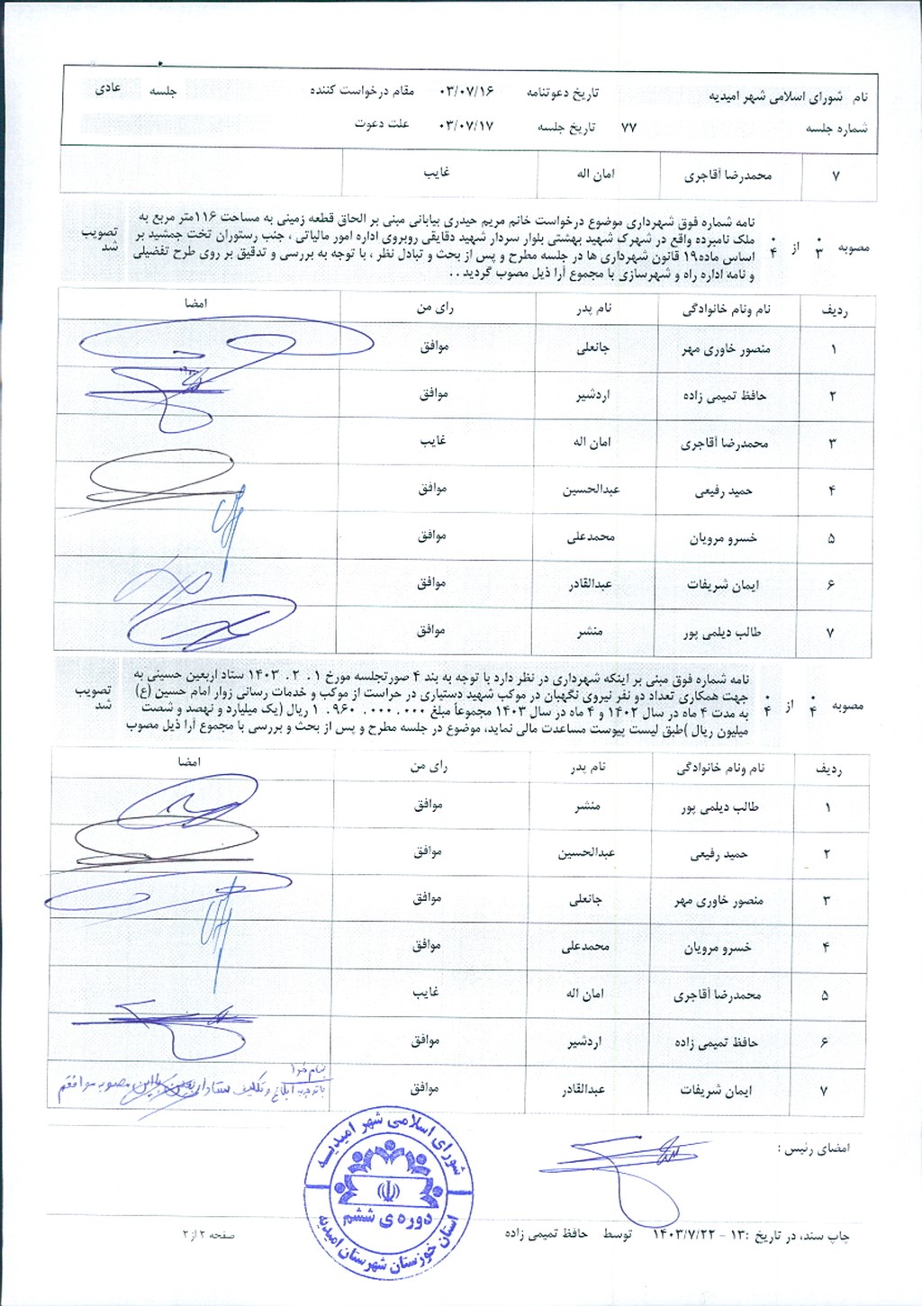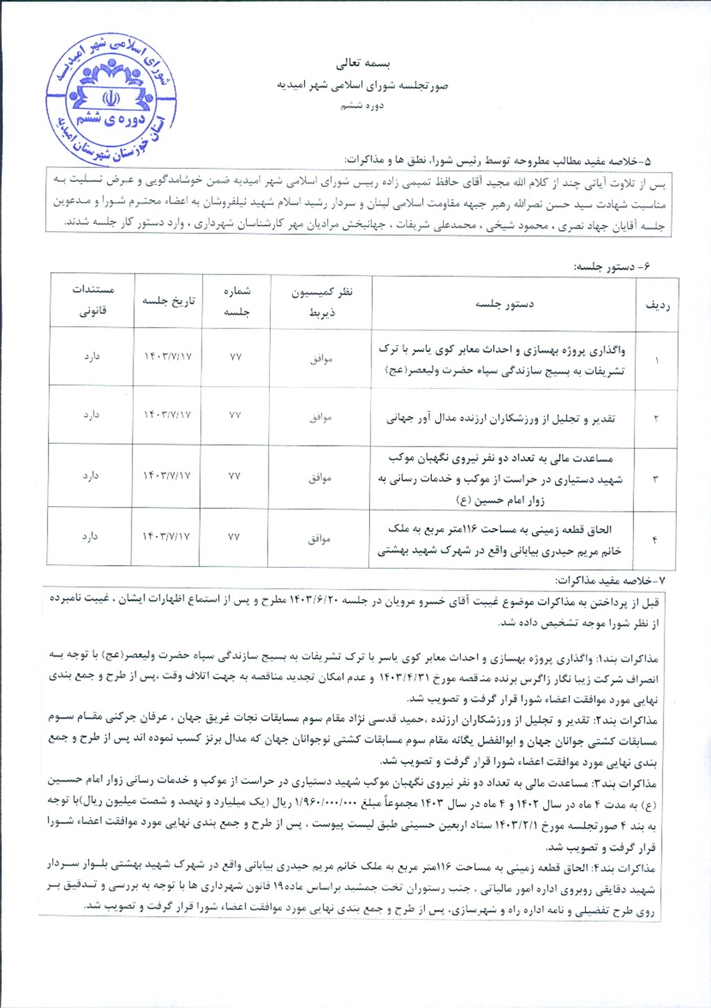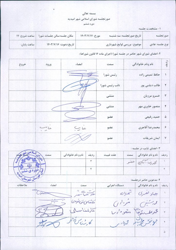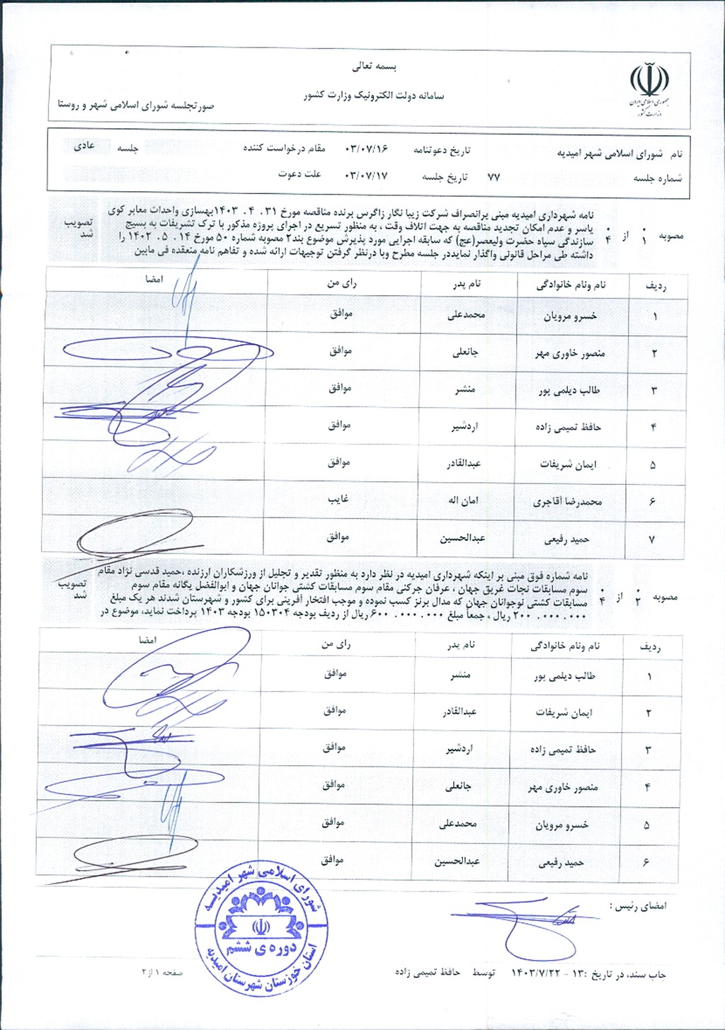گزارش جلسه شماره ۷۷ مورخ ۱۴۰۳/۷/۱۷ شورای اسلامی شهر امیدیه