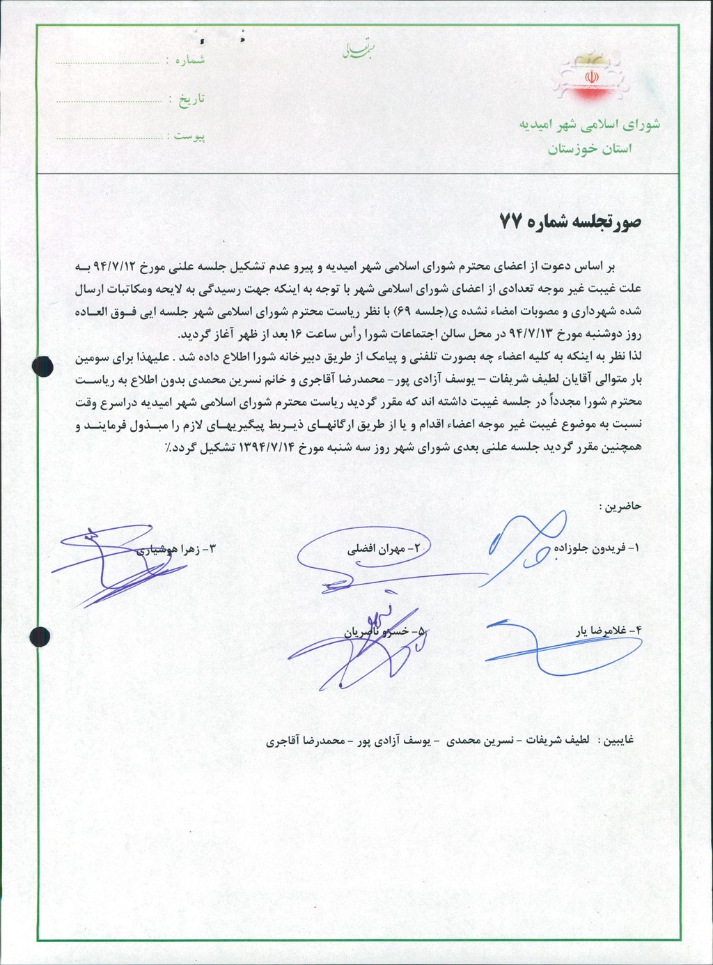 گزارش جلسه شماره ۷۷ مورخ ۹۴/۷/۱۲ شورای اسلامی شهر امیدیه