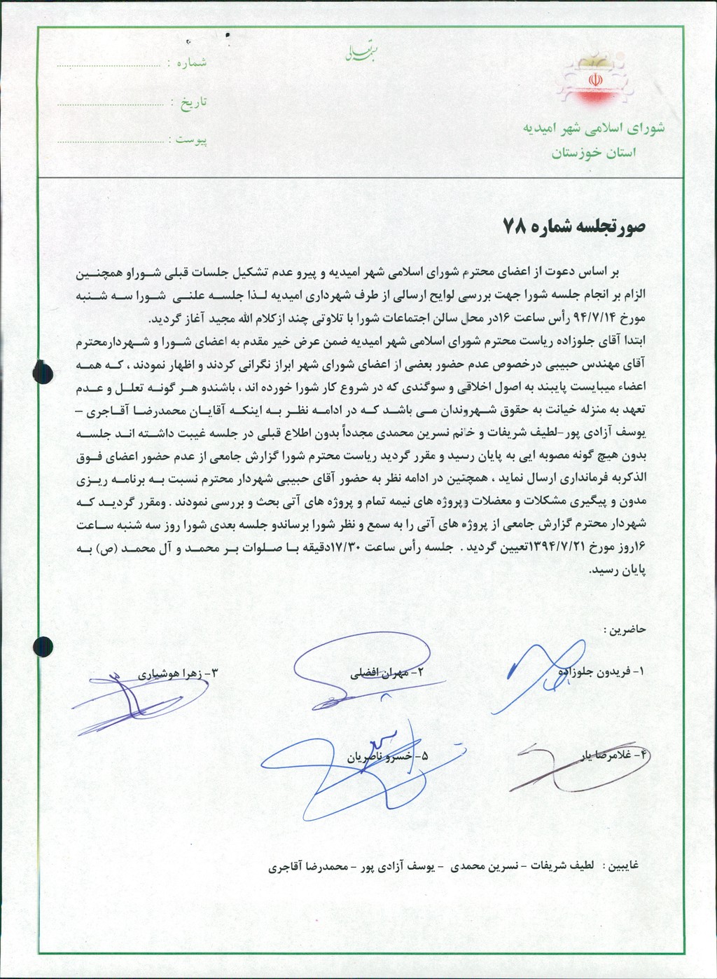 ابتدا آقای جلوزاده ریاست محترم شورای اسلامی شهر امیدیه ضمن عرض خیر مقدم به اعضای شورا و شهردارمحترم آقای مهندس حبیبی درخصوص عدم حضور بعضی از اعضای شورای شهر ابراز نگرانی کردند و اظهار نمودند ، که همه اعضاء میبایست پایبند به اصول اخلاقی و سوگندی که در شروع کار شورا خورده اند ، باشند و هر گونه تعلل و عدم تعهد به منزله خیانت به حقوق شهروندان می باشد که در ادامه نظر به اینکه آقایان محمدرضا آقاجری – یوسف آزادی پور- لطیف شریفات و خانم نسرین محمدی مجدداً بدون اطلاع قبلی در جلسه غیبت داشته اند جلسه بدون هیچ گونه مصوبه ایی به پایان رسید و مقرر گردید ریاست محترم شورا گزارش جامعی از عدم حضور اعضای فوق الذکربه فرمانداری ارسال نماید ، همچنین در ادامه نظر به حضور آقای حبیبی شهردار محترم نسبت به برنامه ریزی مدون و پیگیری مشکلات و معضلات وپروژه های نیمه تمام و پروژه های آتی بحث و بررسی نمودند . ومقرر گردید که شهردار محترم گزارش جامعی از پروژه های آتی را به سمع و نظر شورا برساندو جلسه بعدی شورا روز سه شنبه ساعت ۱۶روز مورخ ۲۱/۷/۱۳۹۴تعیین گردید . جلسه رأس ساعت ۳۰/۱۷دقیقه با صلوات بر محمد و آل محمد (ص) به پایان رسید.