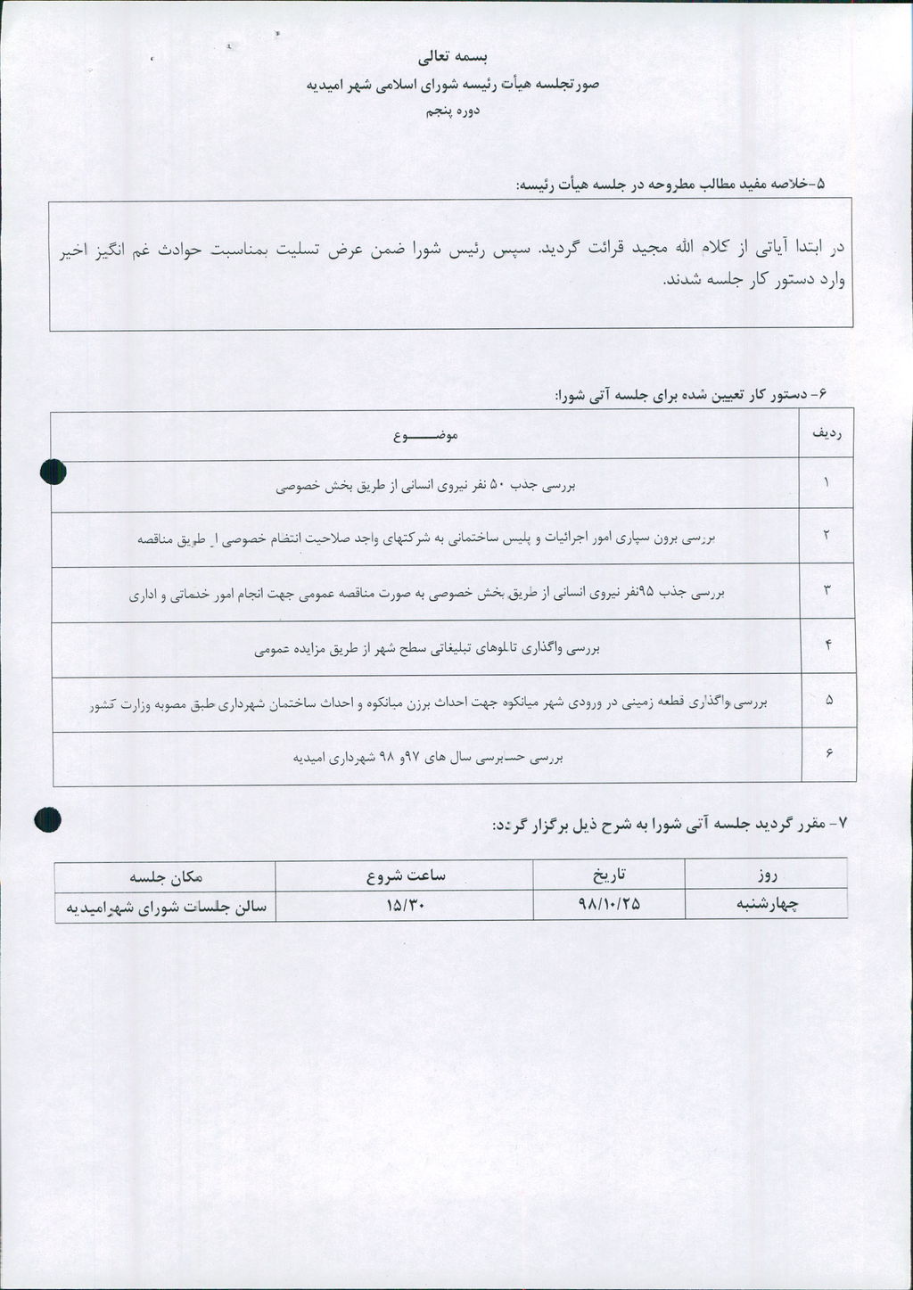 گزارش جلسه شماره ۷۹ مورخ ۹۸/۱۰/۲۴ هیئت رئیسه شورای اسلامی شهر امیدیه