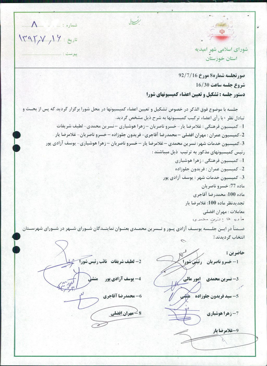گزارش جلسه شماره ۸ مورخ ۹۲/۷/۱۶ شورای اسلامی شهر امیدیه