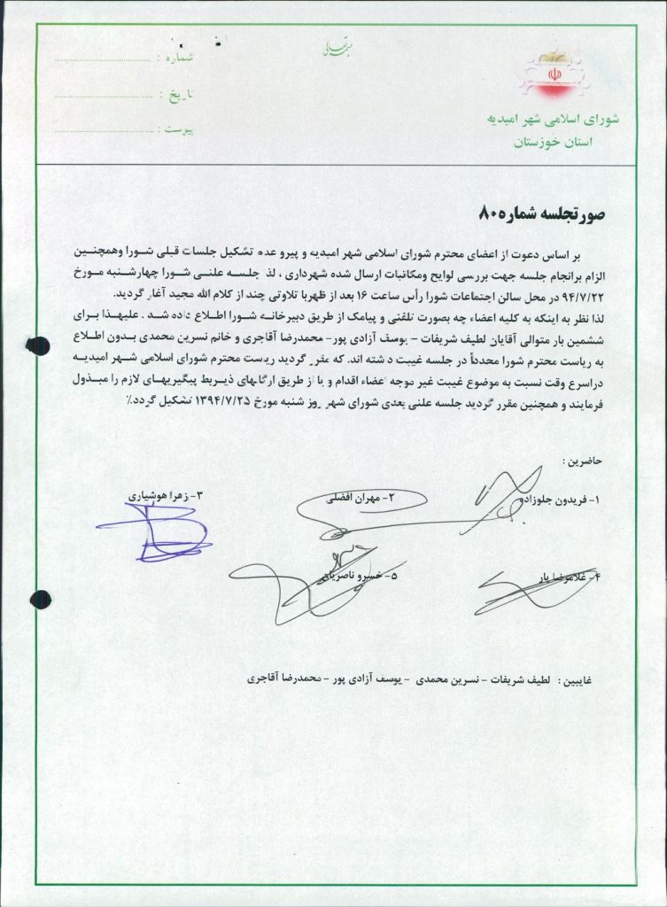 لذا نظر به اینکه به کلیه اعضاء چه بصورت تلفنی و پیامک از طریق دبیرخانه شورا اطلاع داده شد . علیهذا برای ششمین بار متوالی آقایان لطیف شریفات – یوسف آزادی پور- محمدرضا آقاجری و خانم نسرین محمدی بدون اطلاع به ریاست محترم شورا مجدداً در جلسه غیبت داشته اند. که مقرر گردید ریاست محترم شورای اسلامی شهر امیدیه دراسرع وقت نسبت به موضوع غیبت غیر موجه اعضاء اقدام و یا از طریق ارگانهای ذیربط پیگیریهای لازم را مبذول فرمایند و همچنین مقرر گردید جلسه علنی بعدی شورای شهر روز شنبه مورخ ۲۵/۷/۱۳۹۴ تشکیل گردد%