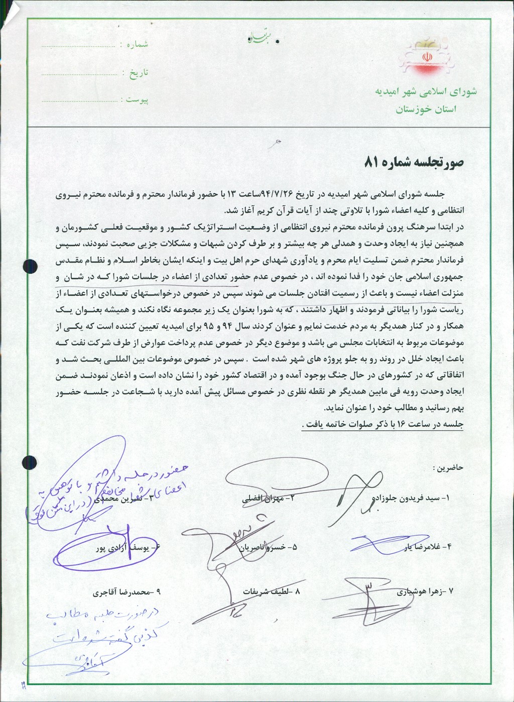 جلسه شورای اسلامی شهر امیدیه در تاریخ ۲۶/۷/۹۴ساعت ۱۳ با حضور فرماندار محترم و فرمانده محترم نیروی انتظامی و کلیه اعضاء شورا با تلاوتی چند از آیات قرآن کریم آغاز شد.