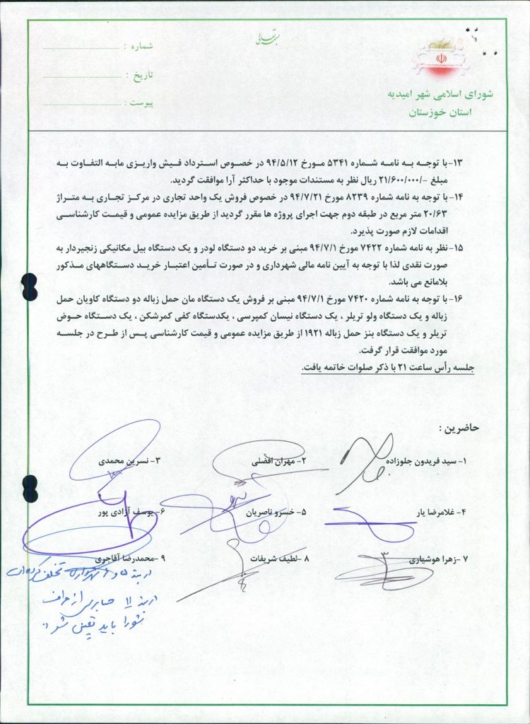 • با توجه به نامه شماره ۷۴۲۰ مورخ ۱/۷/۹۴ مبنی بر فروش یک دستگاه مان حمل زباله دو دستگاه کاویان حمل زباله و یک دستگاه ولو تریلر ، یک دستگاه نیسان کمپرسی ، یکدستگاه کفی کمرشکن ، یک دستگاه حوض تریلر و یک دستگاه بنز حمل زباله ۱۹۲۱ از طریق مزایده عمومی و قیمت کارشناسی پس از طرح در جلسه مورد موافقت قرار گرفت.