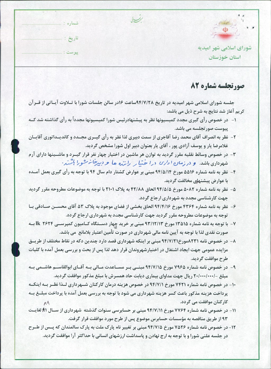 گزارش جلسه شماره ۸۲ مورخ ۹۴/۷/۲۸ شورای اسلامی شهر امیدیه