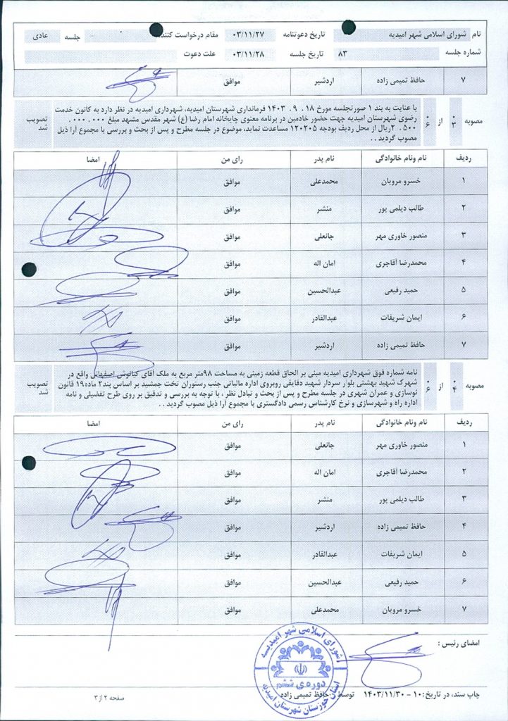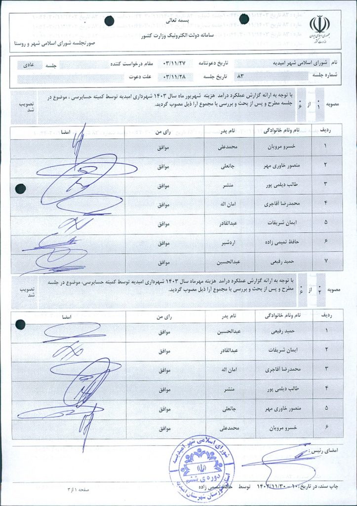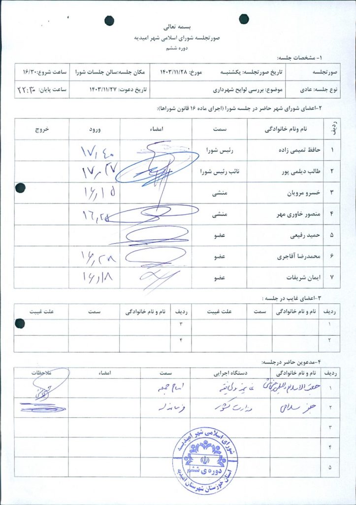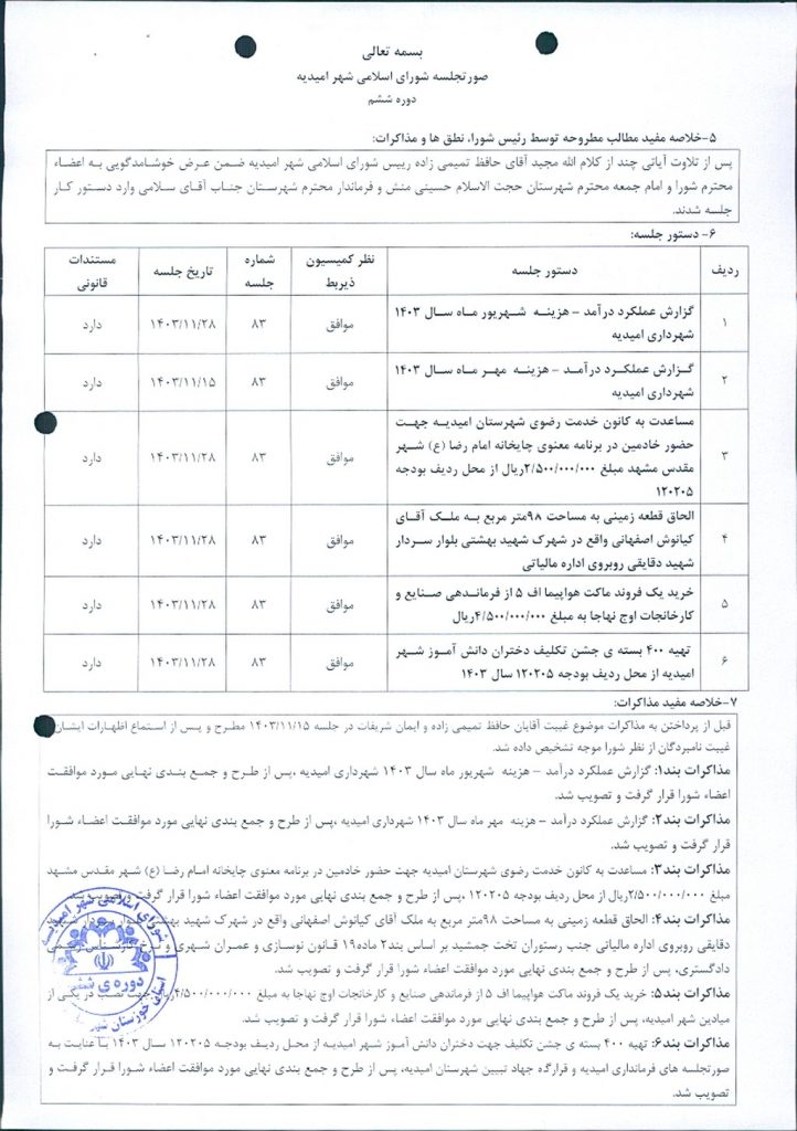 گزارش جلسه شماره ۸۳ مورخ ۱۴۰۳/۱۱/۲۸ شورای اسلامی شهر امیدیه