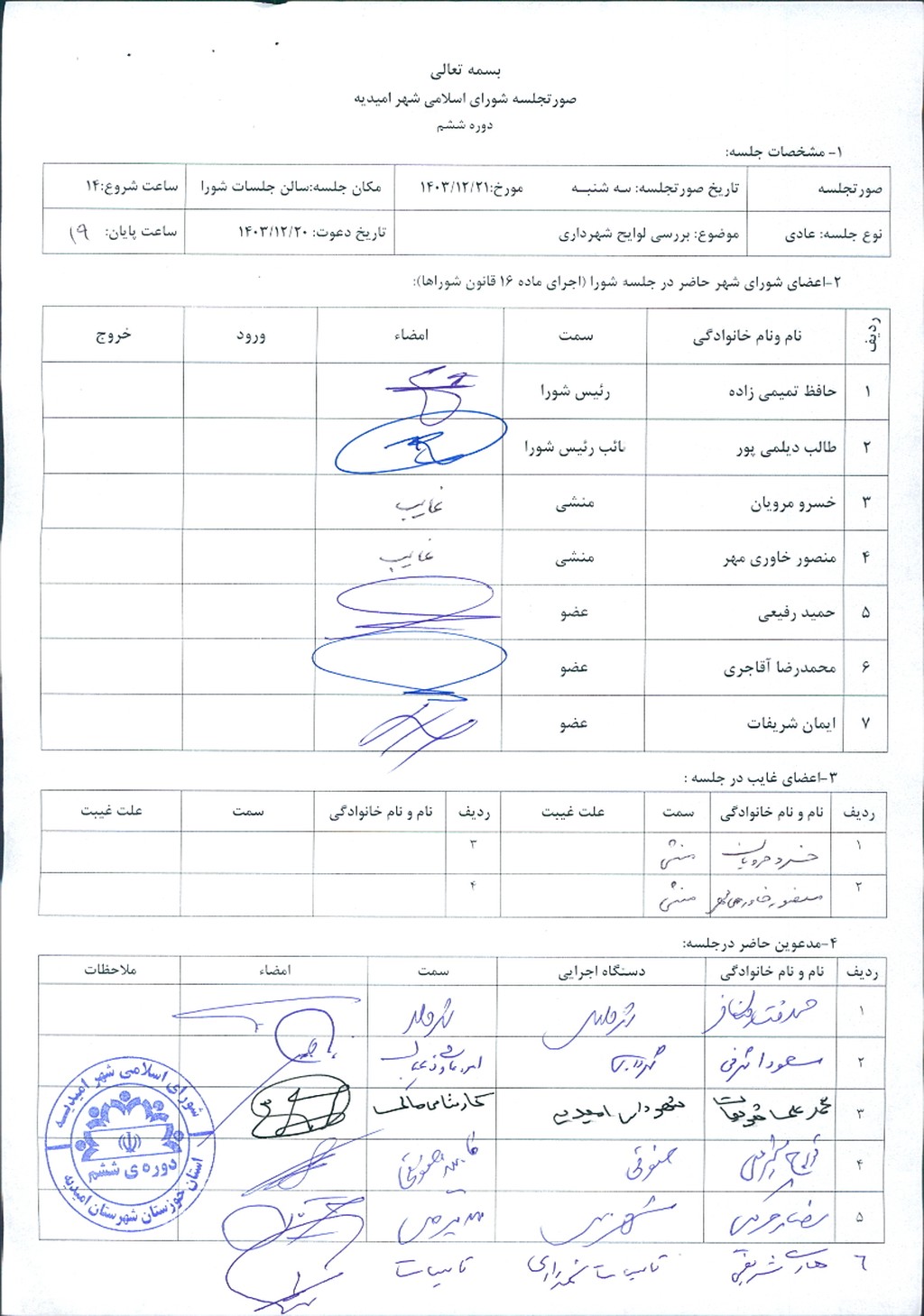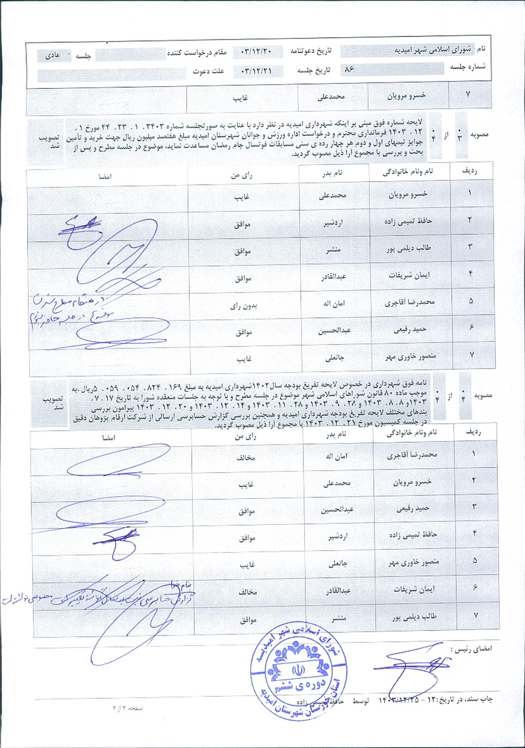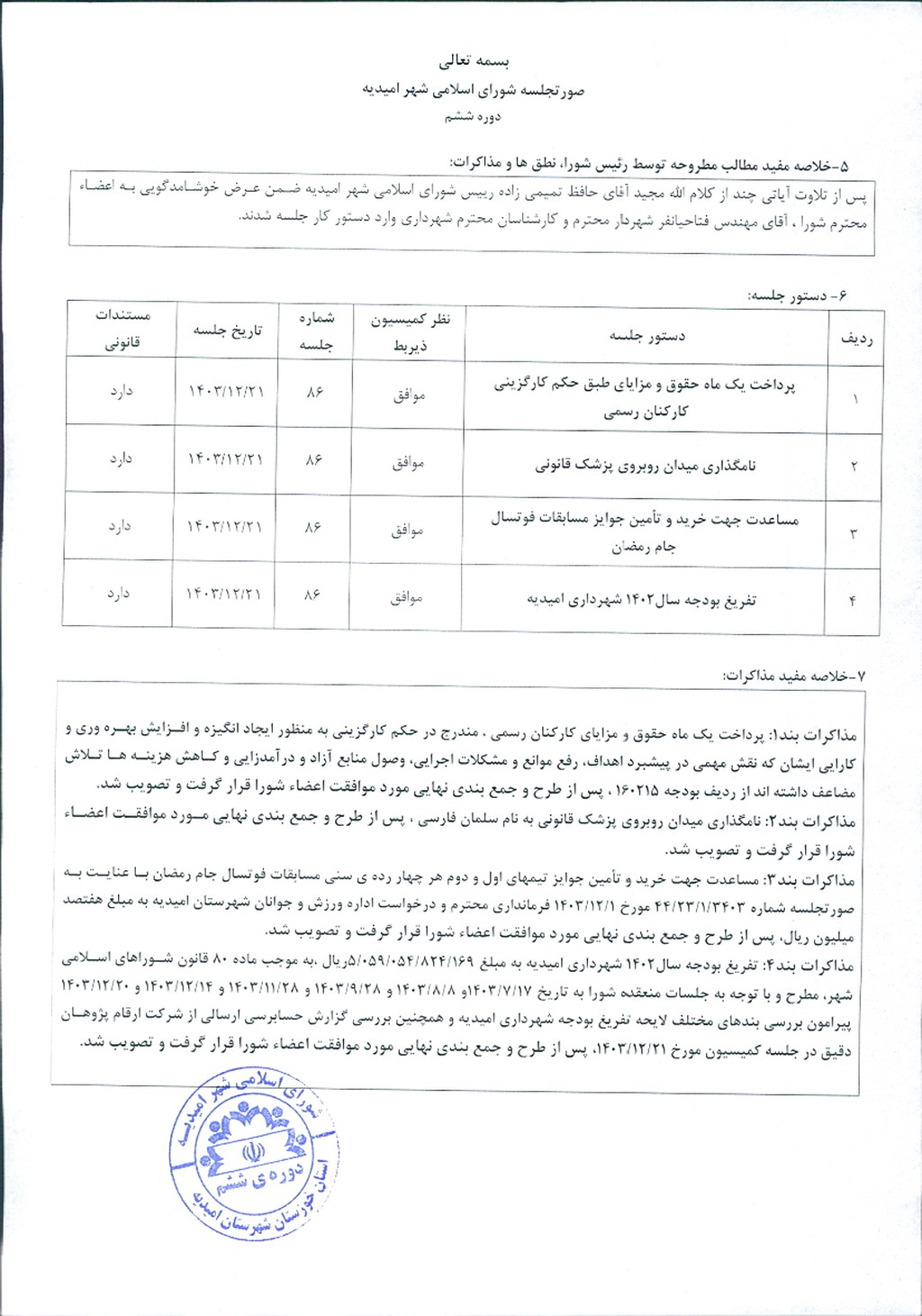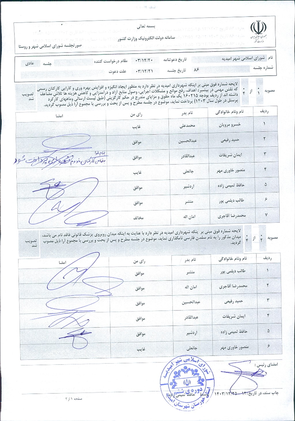 گزارش جلسه شماره ۸۶ مورخ ۱۴۰۳/۱۲/۲۱ شورای اسلامی شهر امیدیه