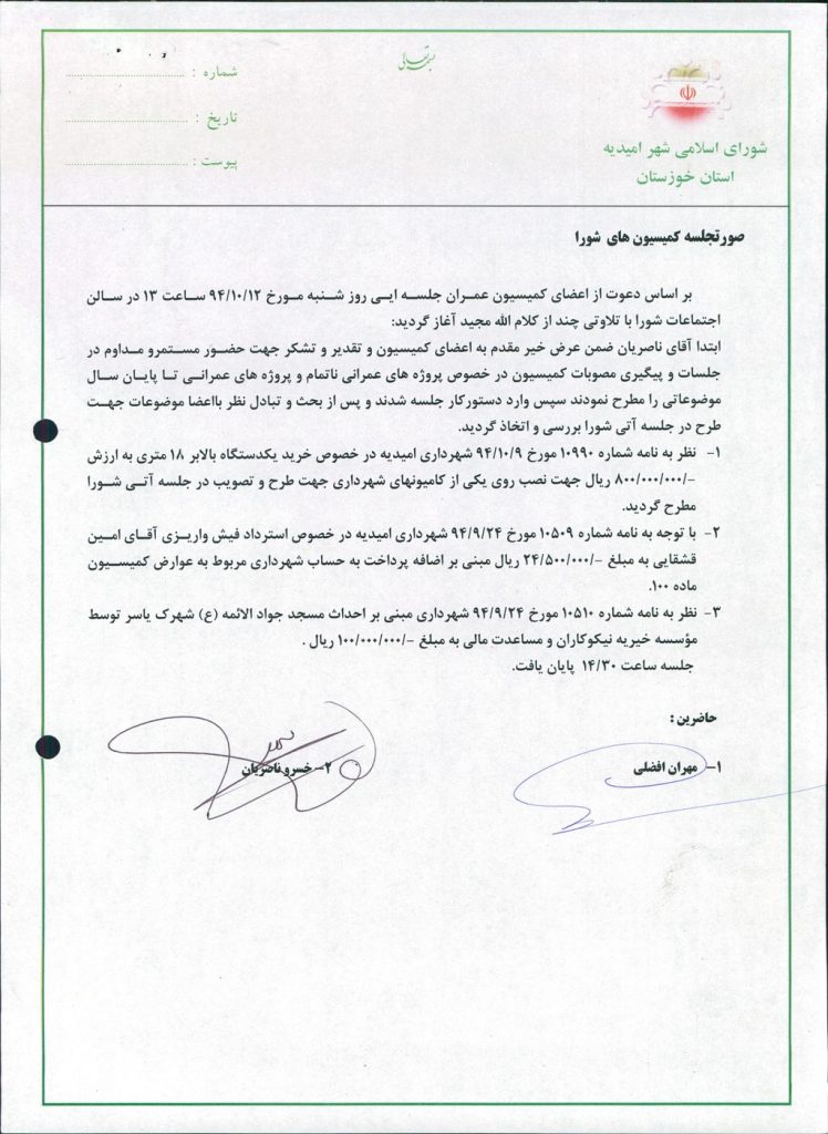 • نظر به نامه شماره ۱۰۵۱۰ مورخ ۲۴/۹/۹۴ شهرداری مبنی بر احداث مسجد جواد الائمه (ع) شهرک یاسر توسط مؤسسه خیریه نیکوکاران و مساعدت مالی به مبلغ ۱۰۰۰۰۰۰۰۰ ریال .