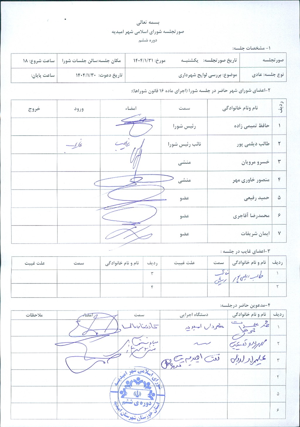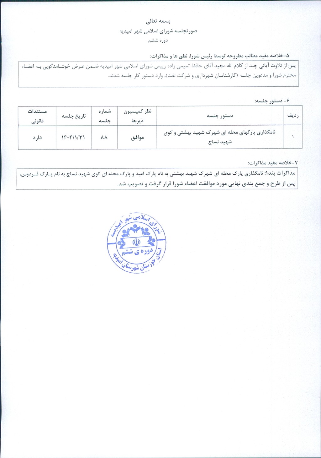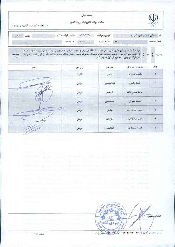گزارش جلسه شماره ۸۸ مورخ ۱۴۰۴/۱/۳۱ شورای اسلامی شهر امیدیه