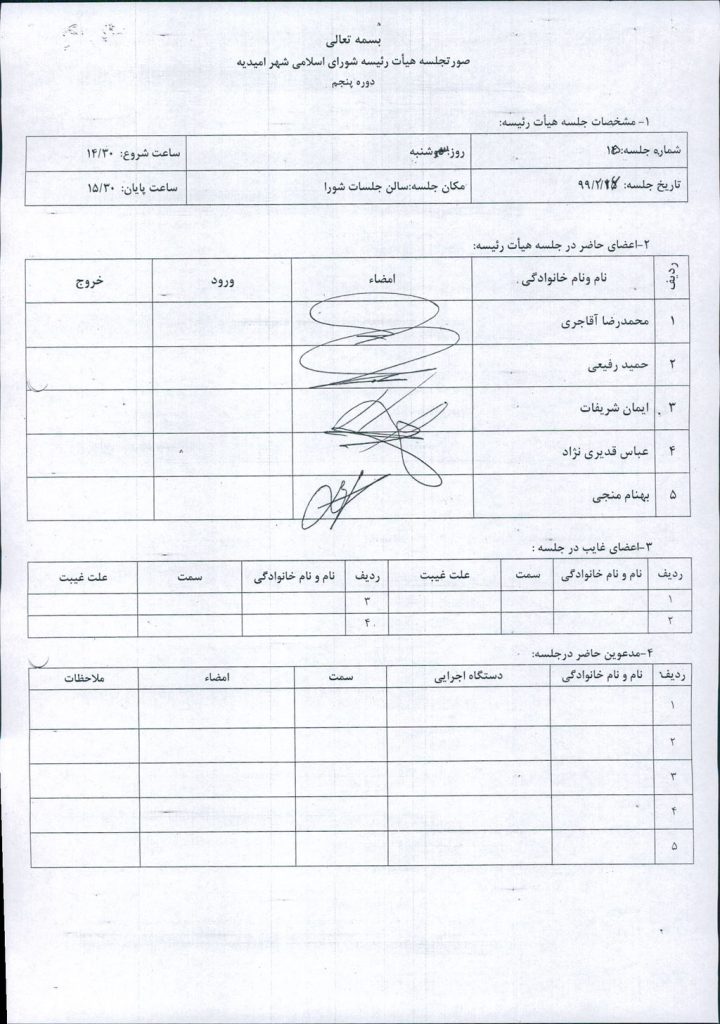 گزارش جلسه شماره ۸۸ مورخ ۹۹/۲/۱۶ هیئت رئیسه شورای اسلامی شهر امیدیه