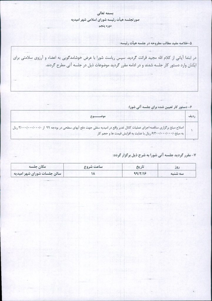 اصلاح مبلغ برگزاری مناقصه اجرای عملیات کانال غدیر واقع در امیدیه سفلی جهت دفع آبهای سطحی در بودجه ۹۹ از ۳۰۰۰۰۰۰۰۰۰ ریال به مبلغ۶۳۰۰۰۰۰۰۰۰ریال با عنایت به افزایش قیمت ها و حجم کار.