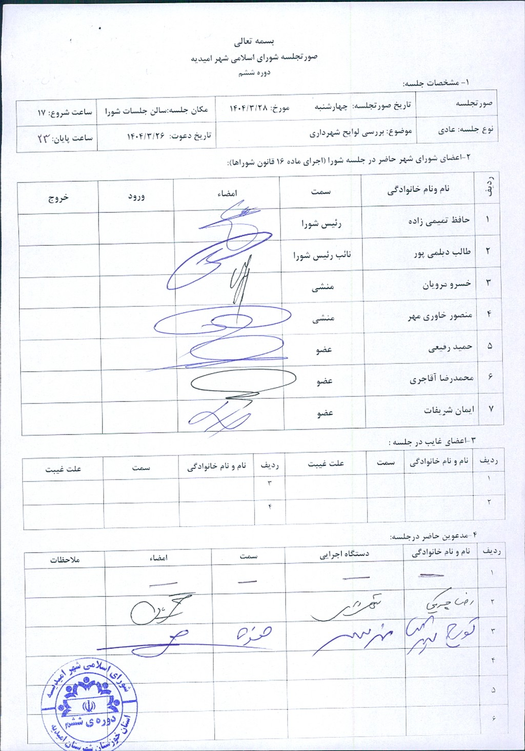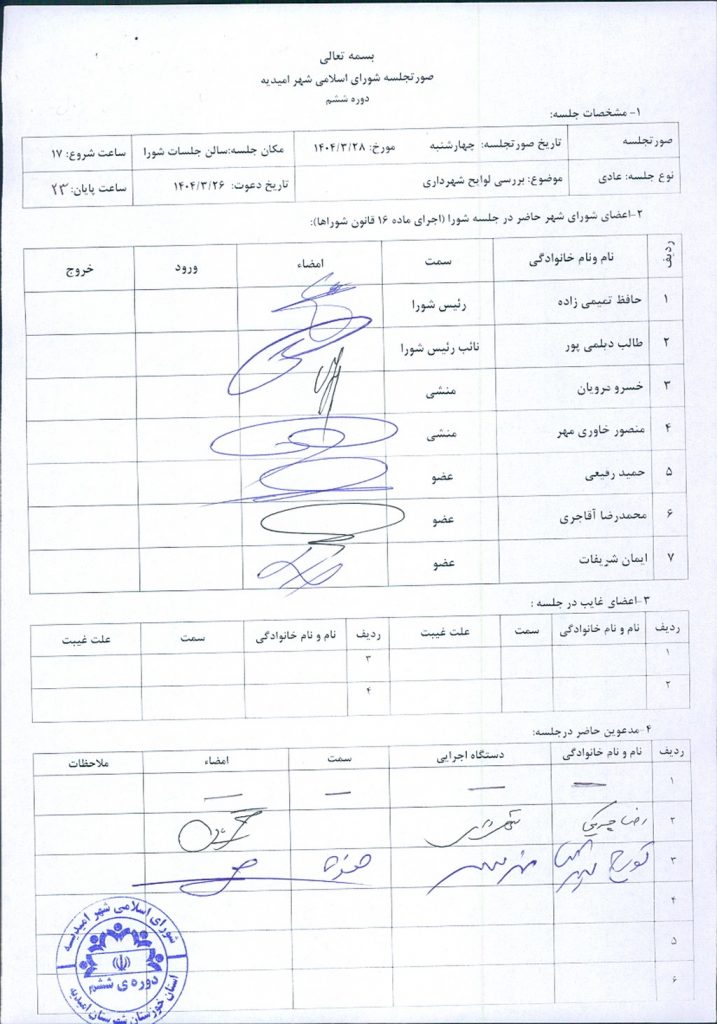 پس از تلاوت آیاتی چند از کلام الله مجید آقای حافظ تمیمی زاده رییس شورای اسلامی شهر امیدیه ضمن عرض خوشامدگویی به اعضاء محترم شورا و کارشناسان شهرداری و محکوم نمودن حملات رژیم غاصب صهیونیستی به کشورمان همچنین تسلیت به مناسبت شهادت سرداران سپاه اسلام و جمعی از دانشمندان هسته ای و هموطنانمان وارد دستور کار جلسه شدند